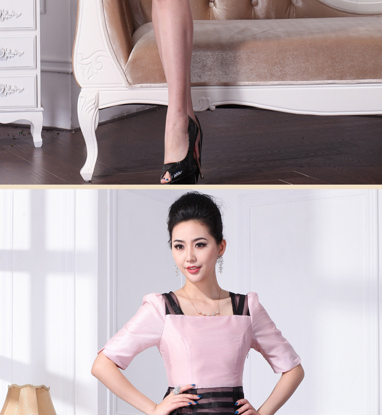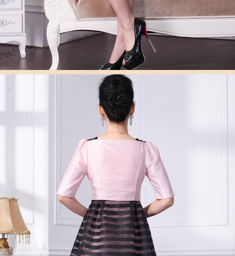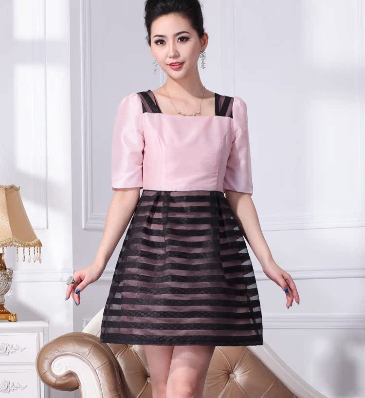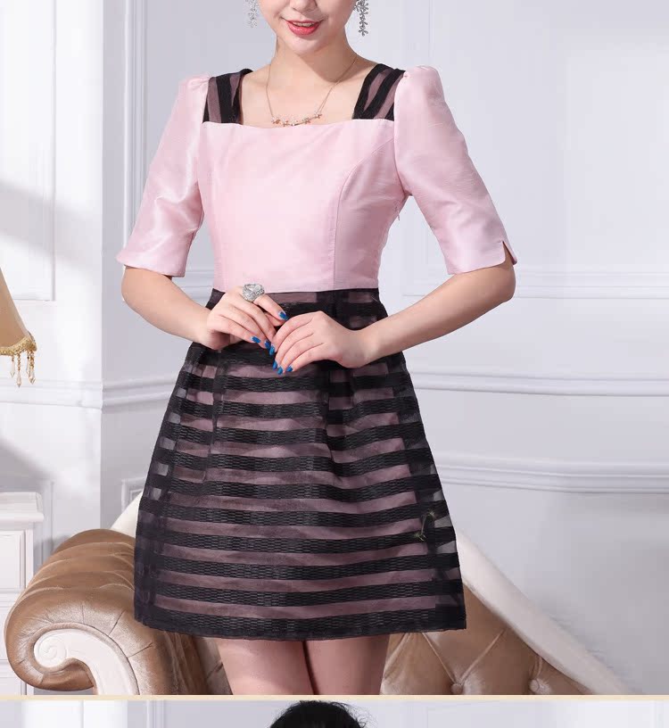 网店代理一件代发欧根纱织条 双色拼接连衣裙 复古宫廷方领连衣裙