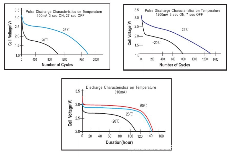 在23℃下,使用1mA放电至2.0v时,容量可达1.5