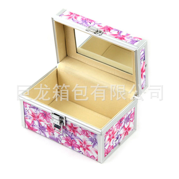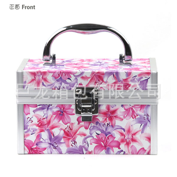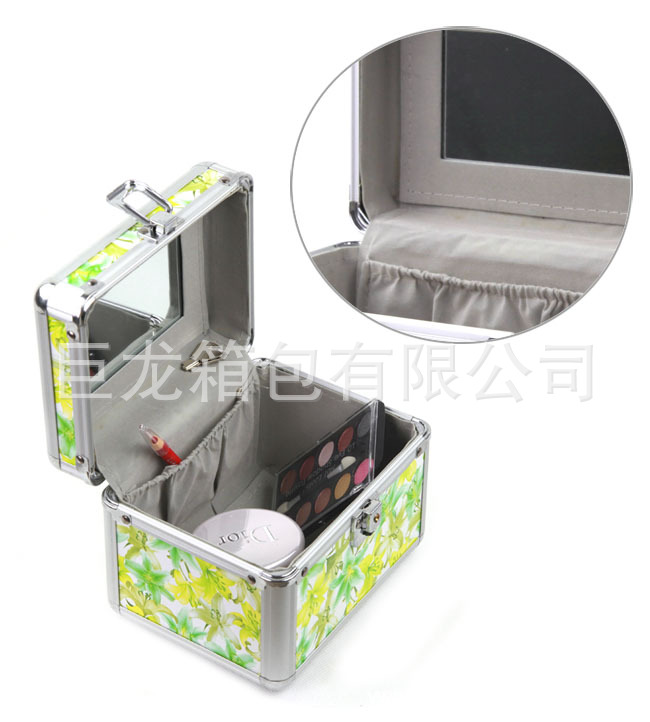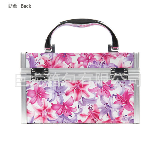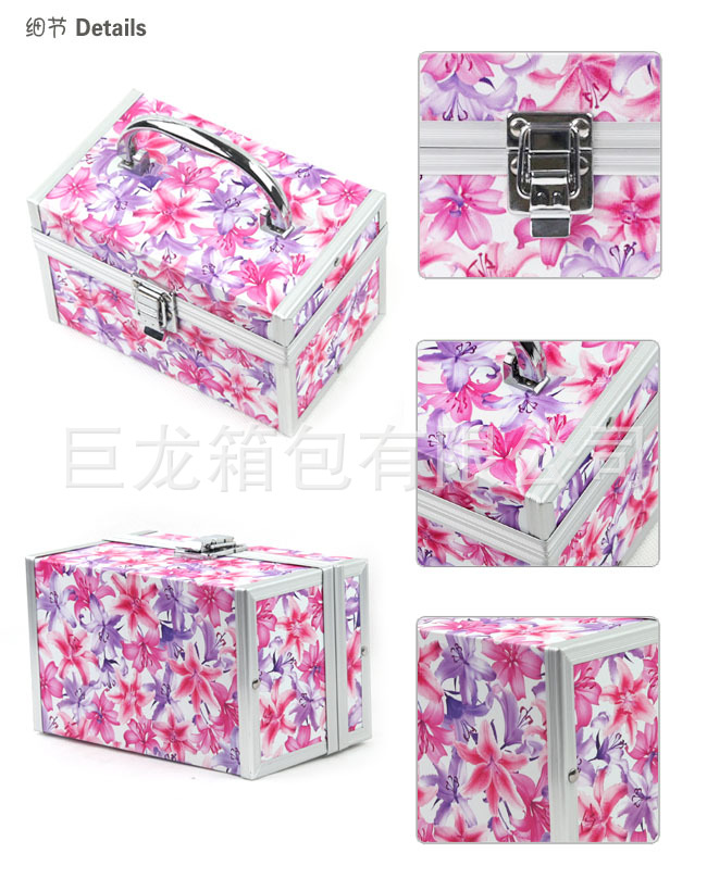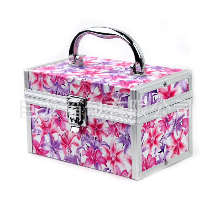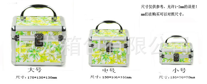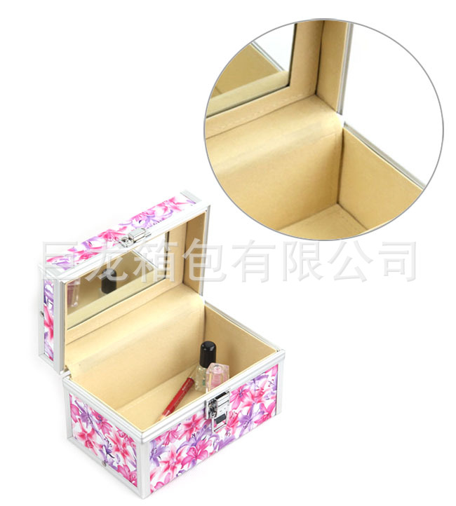 该款化妆箱为铝条边框,PVC面料加密度板,内衬为植绒布,上盖带一块化妆镜子。箱子尺寸不限,可根据客户具体要求进行生产。化妆精巧可爱、深受广大爱美女式的喜爱。