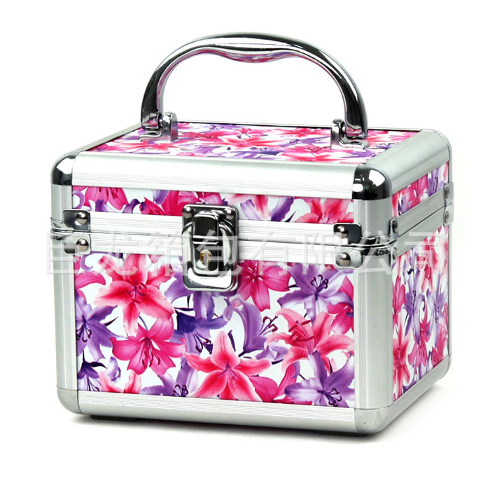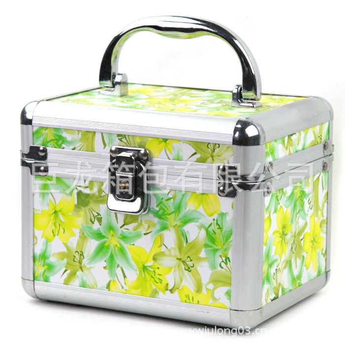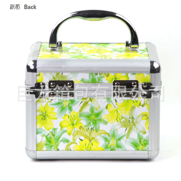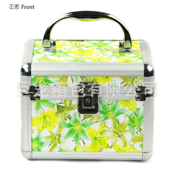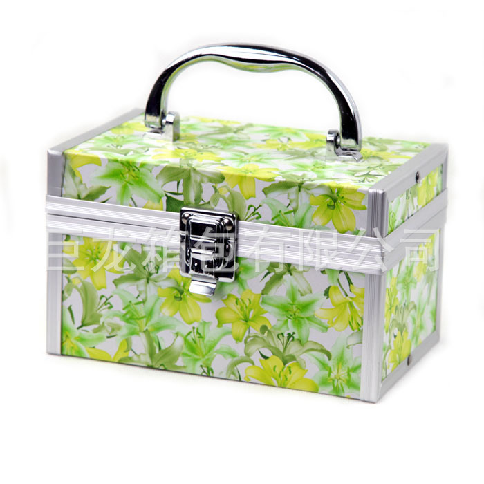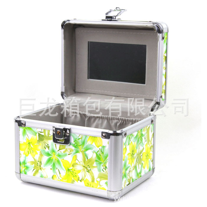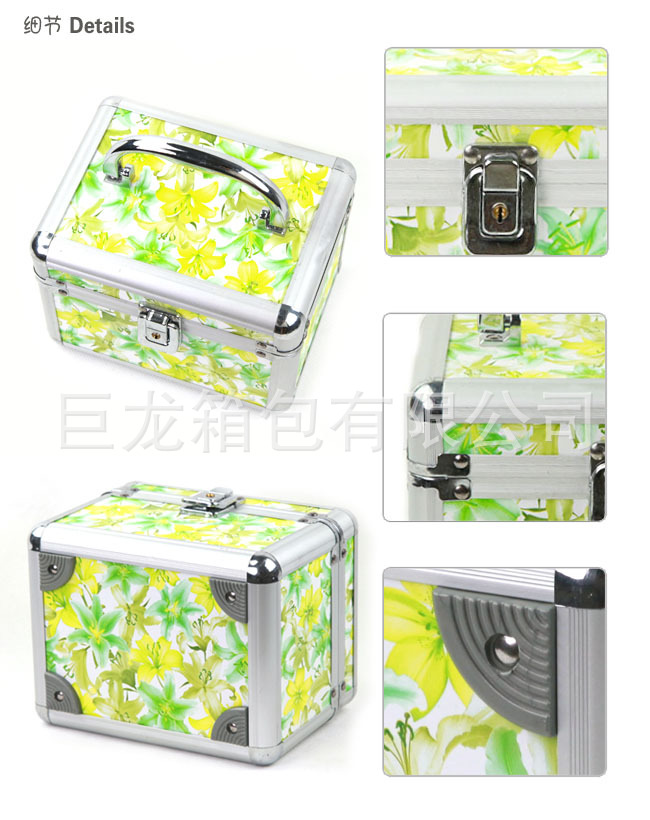 该款化妆箱为铝条边框,PVC面料加密度板,内衬为植绒布,上盖带一块化妆镜子。箱子尺寸不限,可根据客户具体要求进行生产。化妆精巧可爱、深受广大爱美女式的喜爱。