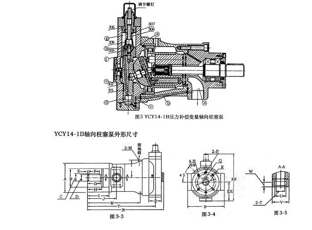 图3-1表示YCY14-1B泵的变量特性曲线,其阴影表示特性调节范围。AB的的斜率是由外弹簧(307)刚度决定的,BC的斜率是由外弹簧(307)和内弹簧(306)的合成,刚度决定的,CD的长短取决于限位螺钉的位置(限制变量头的倾斜角)。