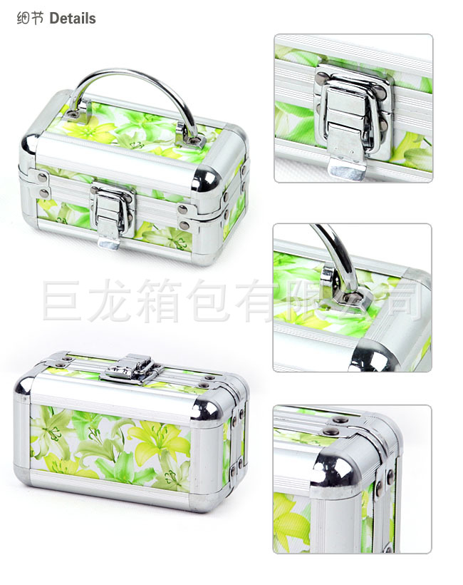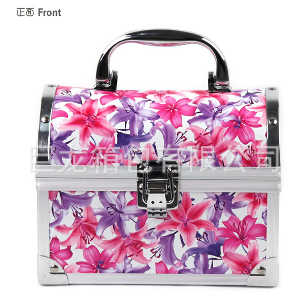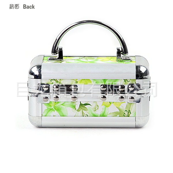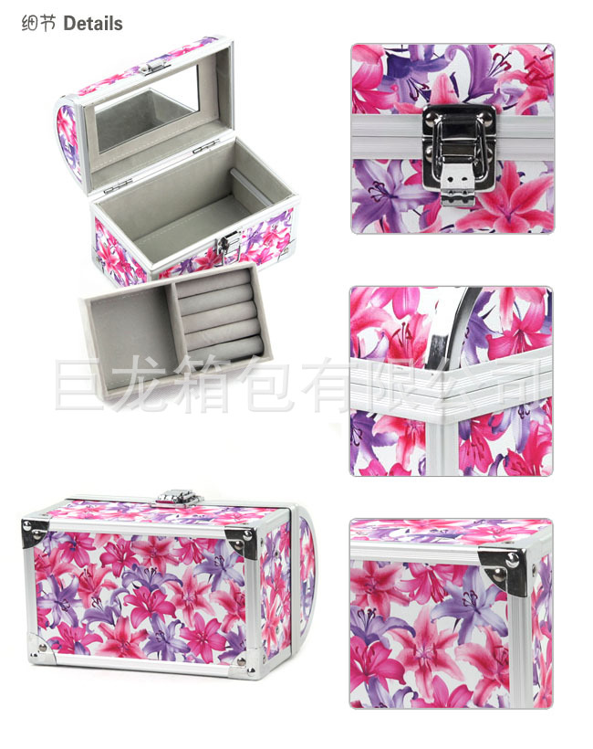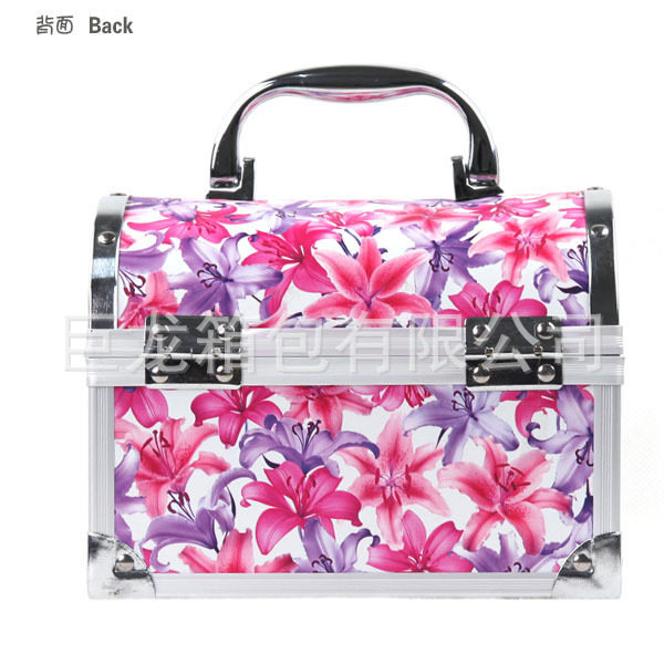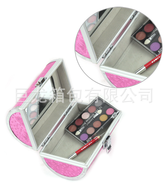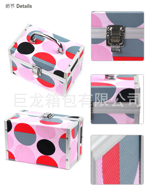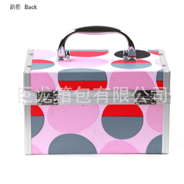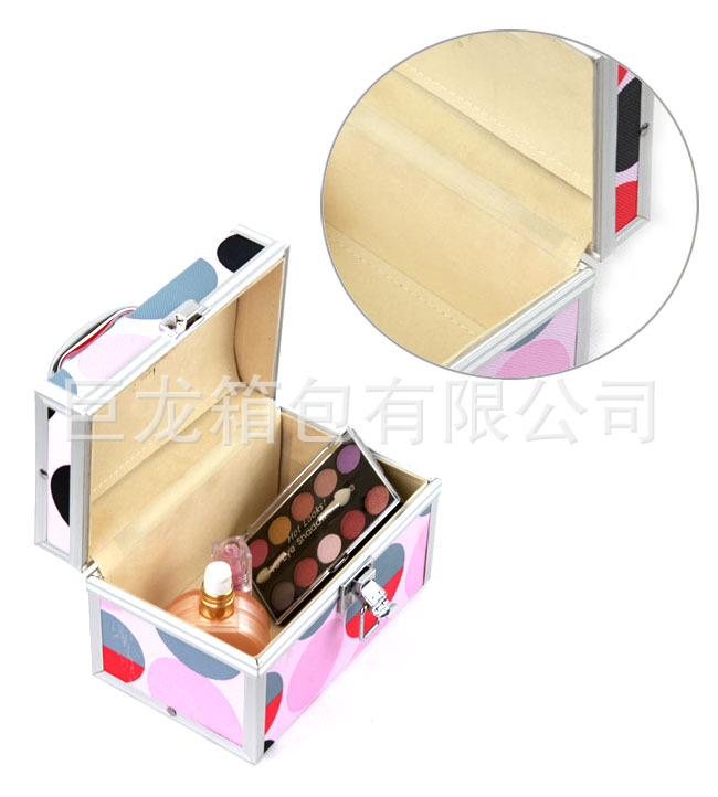 该款化妆箱为铝条边框,PVC面料加密度板,内衬为植绒布,上盖带一块化妆镜子。箱子尺寸不限,可根据客户具体要求进行生产。化妆精巧可爱、深受广大爱美女式的喜爱。