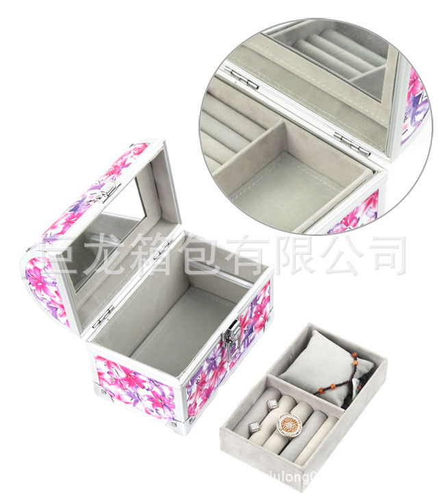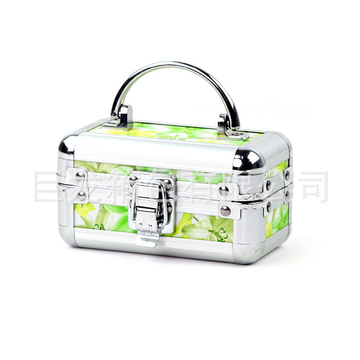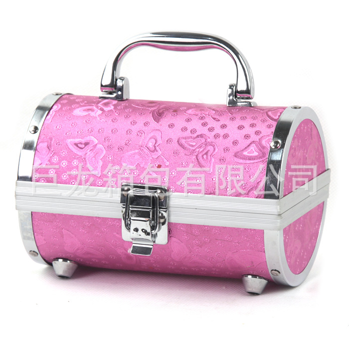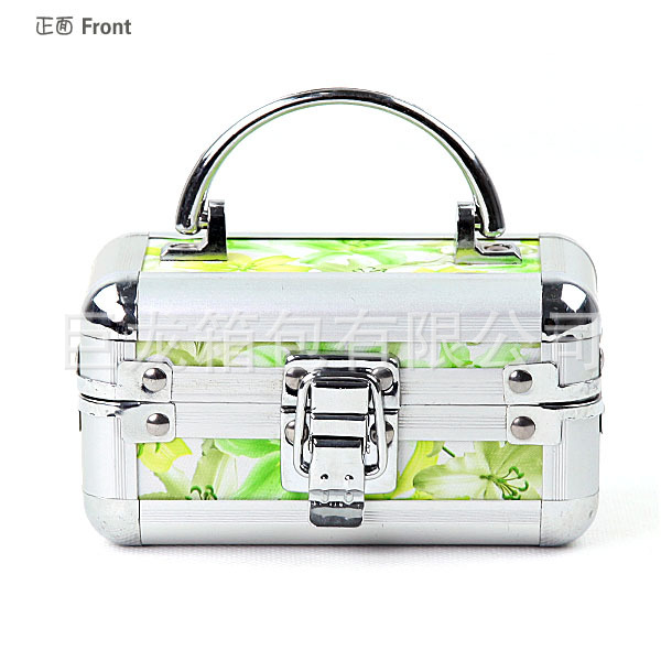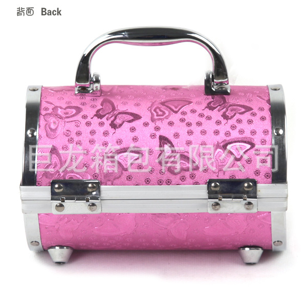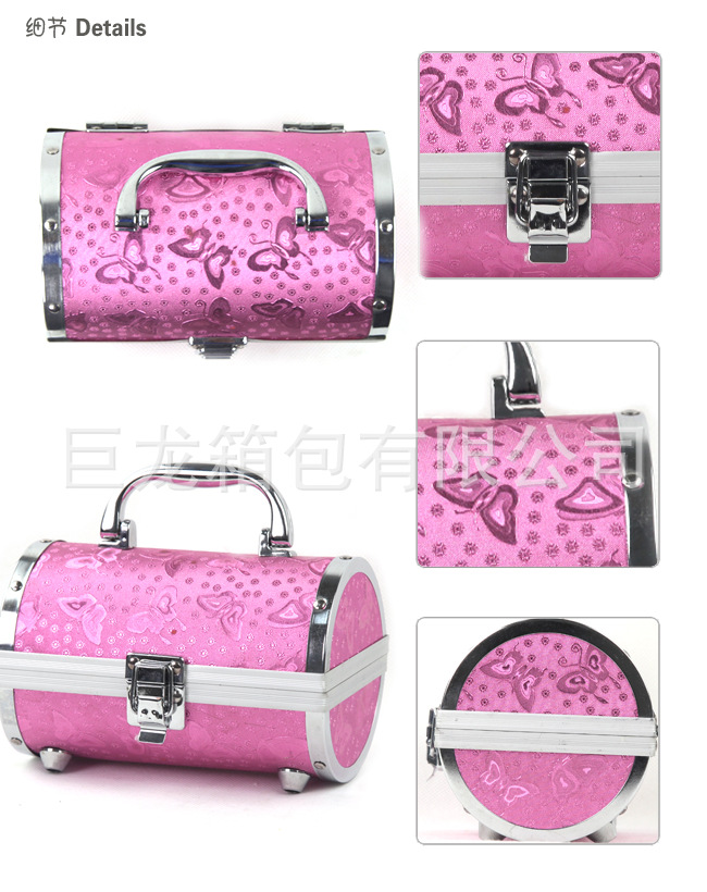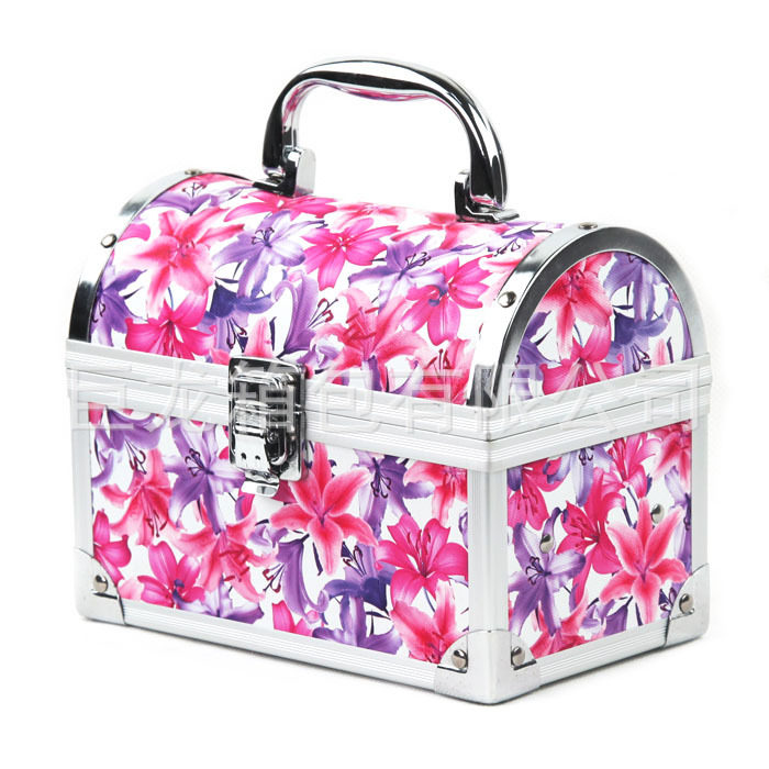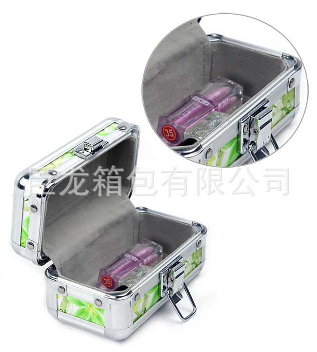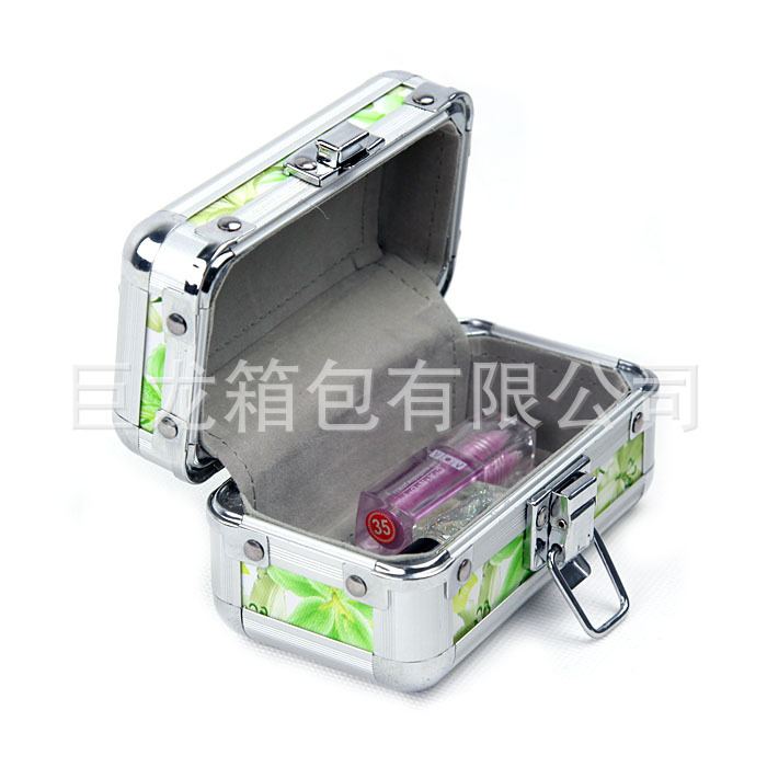 该款化妆箱为铝条边框,PVC面料加密度板,内衬为植绒布,上盖带一块化妆镜子。箱子尺寸不限,可根据客户具体要求进行生产。化妆精巧可爱、深受广大爱美女式的喜爱。