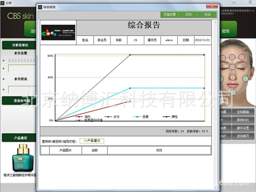 4、所有项目分析完之后,会生成皮肤分析报告,报告里面有所有检测项目的检测数据和结果,以及自动推荐出来的产品或理疗,并可保存或打印报告。