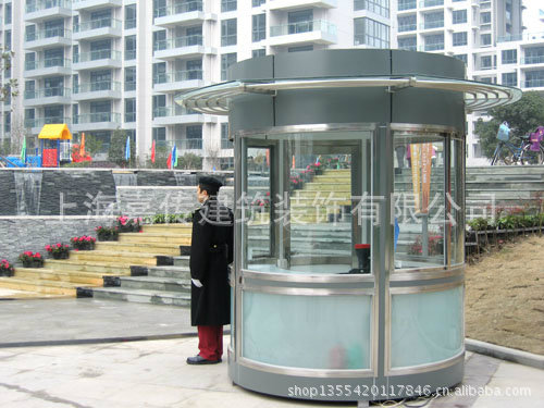 玻璃钢保安亭;外表取用优质不饱和树脂和玻纤布合成外加塑钢透明玻璃窗。 内装修取用木制装饰板.底板表面采用玻璃钢防滑板