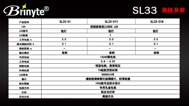 | 单档 | 氙气灯胆 | 3-9v | 240LM-280LM | 2-3小时 |