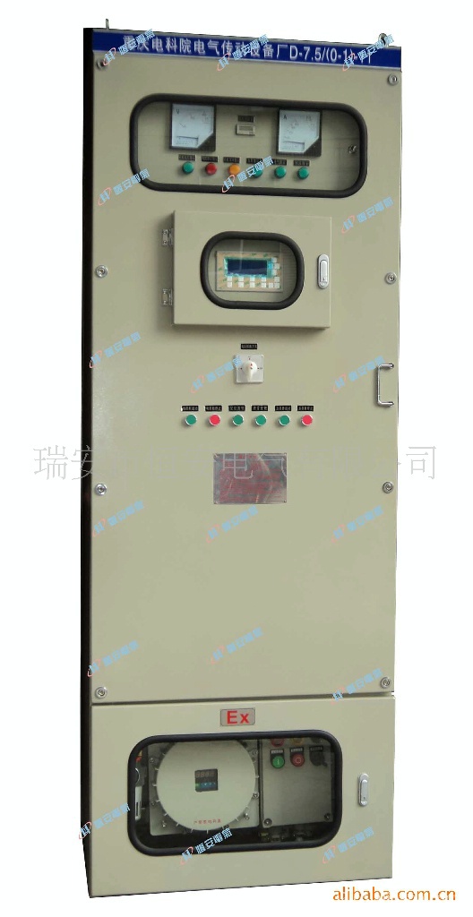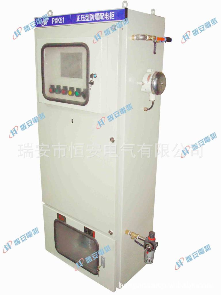 型号含义 PXK-□□/□/□T 特殊要求(无要求可不注) 外形尺寸:宽X高X厚(mm) S:联锁(用户配电与正压自控系统低压联锁) (不要求可不注) t:通风型 b:补偿型 X:箱式 Q:琴台式 G1:柜式1(上下结构) G2:柜式2(左右结构) 正压型防爆配电柜 二 产品结构概述 本产品适用于石油化工、海上钻井平台、冶金、医药、轻工、纺织、食品、生物工程、航天航空工程以及军事设施等工厂中,具有ⅡA、ⅡB、ⅡC类T1~T4爆炸性气体或蒸气环境;海拔高度不超过2000米;25℃时,相对湿度95%以下;工作环境温度-20℃~+40℃之间。可根据用户要求安装各种普通的检测仪表、分 析仪表、显示仪表、变压器、软启动器、变频器、微电脑触摸屏以及普通电器元件,对用户内装电器元件基本不受限制。 配电柜由柜体、自控系统、布气系统、报警系统、配电系统组成;正压腔内装部分控制系统的防爆元件及用户的配电系统元件。 本配电柜采用Q235钢板焊接而成,对其各接合面都经过了特殊的密封处理。 本配电柜进气方式为通风型,即不间断连续供气,正压腔内装元件的工作热量可随气路带走,具有很好的散热效果。 本产品引用GB3836.1-2000 ,GB3836.5-2004以及相关标准设计、制造、检验。 三 产品的工作原理 配电柜在自动控制系统的控制下,通入保护气体,正压腔内压力高于正压腔外的压力,形成微正压的安全小环境,从而阻止了可燃性危险气体进入正压腔内,保证内装普通仪表和电器元件的安全运行。 自动控制系统主要完成手动换气、补气、超高压自动报警和排气、欠压报警、低压联锁断电等系列功能。(本配电柜具有低压联锁功能,低于规定的气压值(50Pa)时,自动切断进入正压腔的用户配电电源) 四 产品的安装 一、 柜体安装 1、 柜体的安装位置:户内或户外有棚顶,无明显震动平坦的地方。 2、 本产品安装方式为落地式和壁挂式,本柜设置了专用于固定的安装孔,具体参数详见技术附件或产品实物。 3、 布线方式为电缆布线,用户电缆结构可参考相关国家标准和行业标准,并结合本柜的结构要求进行设计、施工。 4、 搬运时注意,本产品严禁大幅度倾斜,倾斜度不大于100。 5、 本产品在运输、安装定位时,严禁采用撬、锤等方式进行搬动。否则,可能影响产品的密封性能,导致本产品无法正常运行。 6、 本产品设置了进气口和排气口,供用户接管。用户须按“气路管道布置图”布置进气管道,排气口经过防火阀后在现场排放或引至安全区域排放,用户现场须提供进气气源(保护气体),气源压力一般控制在0.2-0.6MPa,进气气源为净化空气(如:仪表风)或氮气,(注意:在密闭的操作室里,要谨慎使用氮气作为保护气体,若必须使用氮气作保护气体,请注意现场通风,以确保人身安全)。 7、 由于内装工控电器、触摸屏等精密电器,气源进口处需加装干燥过滤器,以确保气源为干燥清洁的空气,否则会影响电器的使用寿命。 8、 严禁进气气源为爆炸性混合气体!! 二、 用户元件的安装 1、 由于内装配电系统元件由用户自行调整,因此,用户必须在安全区内进行设定、调试。 2、 不得撤拆面板上的电器元件,以免影响柜体的气密性能。 三、 电气安装 1、 本产品必须由专业电工,进行操作。 2、 用户按我公司提供的电器系统图、接线图、端子图等技术文件,结合产品实际情况逐一对应进行接线。 3、 接线时,请注意各进出电缆的密封性(严禁将通头中的密封圈弃之不用),并视各电缆的松紧程度,用防爆胶泥作适当的密封处理。 4、 用户的接线、调试完后,将各门关闭时,一定要保证其密封性能。 5、 本柜体必须按要求将接地线接到专用接地螺丝上。 五 产品的调试 本产品出厂时,正压自控部分已经过调试,但用户在具体使用时,仍须根据现场情况重新调试后再使用。 一、 本产品适用于AC220V、50Hz配电系统。 二、 本产品调试分两部分 1、 自控部分调试 1)调试前检查 自动控制系统部分主要为隔爆型防爆电器,主要由防爆控制箱、防爆控制按钮、防爆指示灯、微压表等组成。检查各部分是否完好无损,有无影响防爆性能等,接线是否正确(接控制电源:AC220V),手动排气阀和是否打开。一切正常后方可进行调试。 2)调试方法 调试前,先打开排气手动阀再打开进气手动阀、约换气30分钟后、接通电源,红色“电源”指示灯亮,此时按下起动按钮、绿色“运行”指示灯亮、压力表处于受电状态、再调节进气、排气阀大小,让压力仪表持续显示值维持在200Pa左右。,,自动报警系统进入监控状态;些时,该柜进入正常使用状态。在使用过程中,若由于外界气源原因将正压腔压力升高于1000Pa时,卸压电磁阀将打开、同时报警灯闪烁报警,(此时因立即关小进气手动阀或开大排气手动阀,调节压力持续维持在200Pa左右)。若柜内压力低于100Pa时,进入低压警铃报警状态(此时因立即开大进气手动阀或关小手动排气阀,调节压力持续维持在200Pa左右);当进气故障未排除,而气压值低于50Pa时,自动控制系统将自动切断用户的配电电源,将一直进入欠压报警状态;必须按下停止按钮,才能解除警铃报警状态.气源正常后,将进入新一轮“换气”过程后,操作顺序同上,才能恢复正常工作。 3)调试注意事项: 本产品出厂时,各参数已设定好,严禁用户擅自更改参数。用户在调试时请注意仪表、自控线路及取样管路的畅通。 2、 用户配电系统部分调试 1)本产品经运输、安装等环节后,必须
