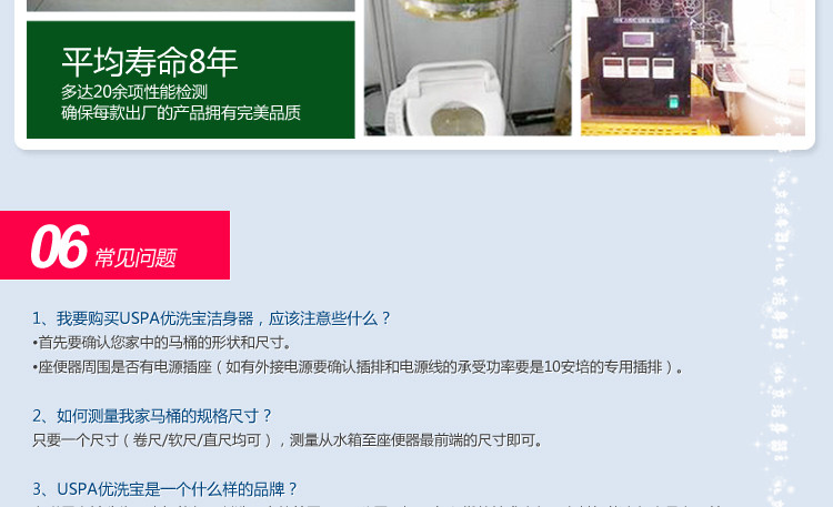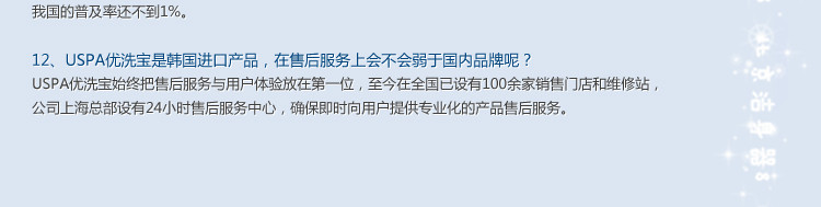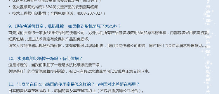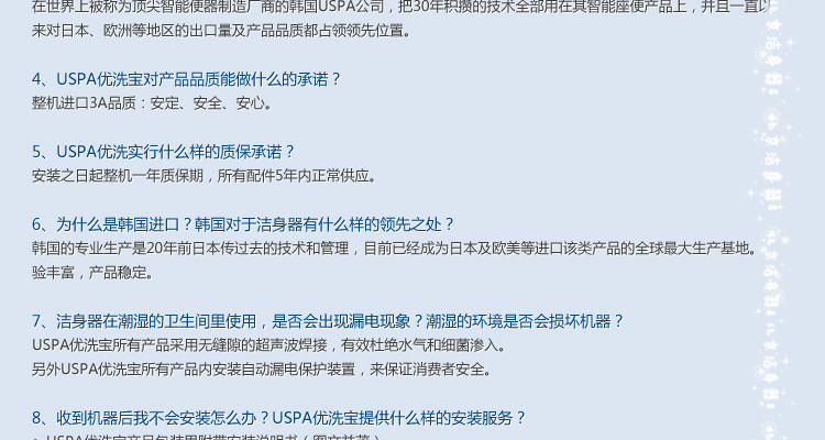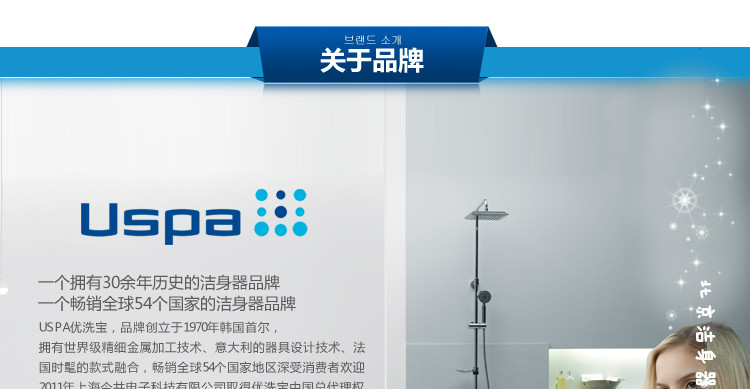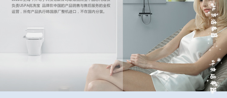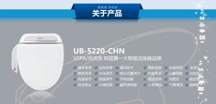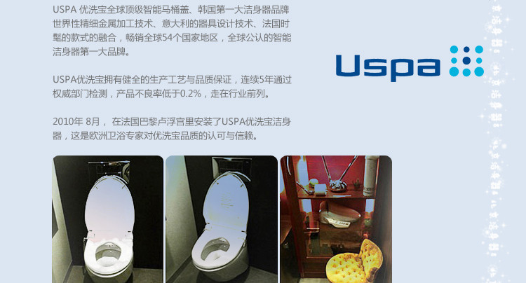 优洗宝uspa 韩国最大品牌洁身器,产品质量过硬,至少五年内没有任何返修,年销售量50万台以上,为各种品牌生产加工,成为全球最大的洁身器品牌。功能齐全,适合老人,儿童不同年龄段需求,老人冲洗,儿童清洗,全自动功能,纳米银离子喷管技术,做到质量第一