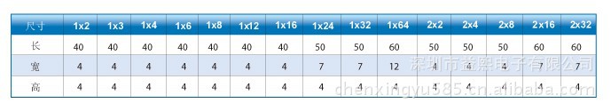 封装规格及尺寸 | 单位 | 1×4 | 1×8 | 1×16 | 1×32 | 1×64 |
