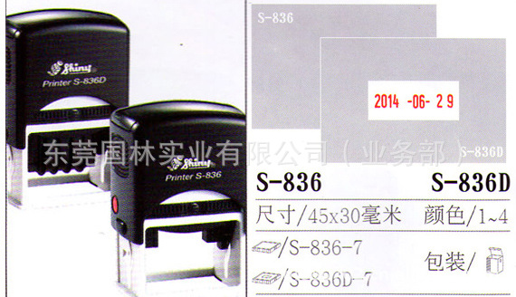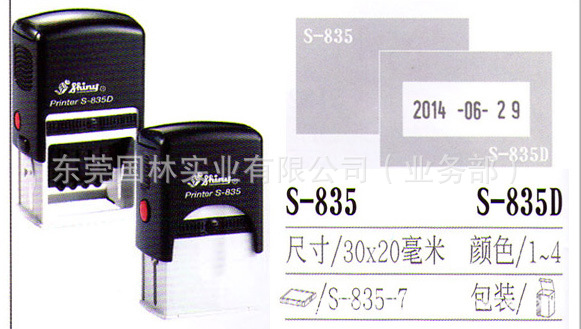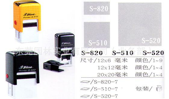 产品特有性能:◆采用ABS工程塑料制作,牢固耐用、轻巧、方便携带。◆内置印台,盖印迅速、印迹清淅毫不费力,让工作更有效率,印台可自行取出重复加注印油。◆日期回墨印中间日期可随意调节,准确印证每天日期。◆可单独更换印面内容,不论方形、圆形、椭圆形、多边形等均可来样订做,属于国际最新环保型印章,在欧美国家使用率达95%以上。台湾shiny新力旗下款式多种,分别有:轻型回墨印,重型回墨印,随身印章,光敏印章,字粒回墨套印,回墨日期印,日期钢印,日期章,号码章,数字章,转动印章,回墨印油,光敏印油,原子印油,水性油墨,新力印台,毛毡印台,海绵印台,防伪指纹印台等等。 新力回墨日期转动印章,全新的线条设计理念,使章体结构更坚固,使用更轻便。也因此提高安全性和印章寿命。 款式多样,轻便小巧,是生产线及签名的首选,印章内容方便更换.流畅及安静的动作也可以保证高品质印迹。台湾shiny新力牌日期印章数字印章产品的特点:根据客户的需要可随意变动日期与数字.它的特殊架结构设计使得其可以随意变更日期与数字,盖印时利用手动的原理调动印章来印出日期与人名的日期章系列,也可根据自己的需要盖印面积的大小订做印章的尺寸及数字的数量与大小。其盖印效果清晰,便于携带,号码及章面分为金属,胶皮两种,盖印时会同时显示日期和人名的日期章系列,有各种合适的尺寸,形状和印面颜色提供多种选择,全面支持商务使用。新力新型回墨日期印型号:S-300、S-303、S-304、S-309、S-400、S-409、S-401、S-449、S-402、S-403、S-404、S-405、S-406、S-407、S-408、S-410、S-311、S-313、S-312、S-314。新力新型回墨印型号:R-512,R-517,R-524,R-532,R-542,R-552,S-520,S-510,S-820,S-530,S-542,S-830,S-831,S-308,S-310,S-832,S-833,S-826,S-827,S-828,S-829,S1821,S1822,S822,S1823,S823,S1824,S824,S1825,S825。新力回墨日期转动印型号:S-1000、R-532D、R-538D、R-542D、R-552D、S-826D、S-827D、S-828D、S-832D。