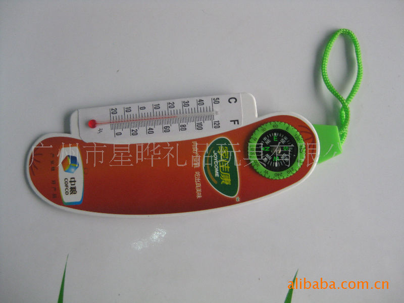 2)温度计冰箱贴:采用下面软胶磁铁+上面铜版纸四色印刷裱光膜+温度计,