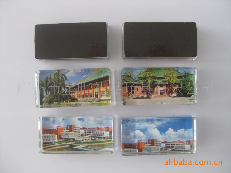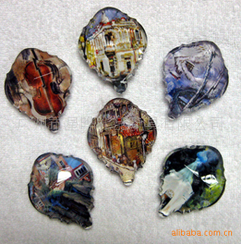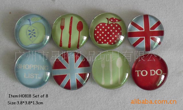 11)玻璃冰箱贴:采用背面软胶磁铁+上面铜版纸彩色印刷+半圆玻璃腹膜制作而成