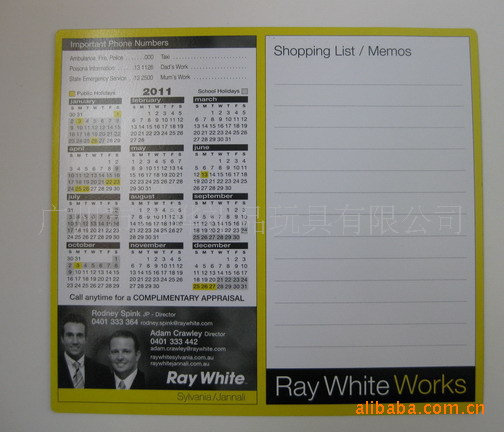 4)磁性留言板 白板:采用软胶磁铁(或纸板)+铜版纸四色印刷裱光膜+可擦笔