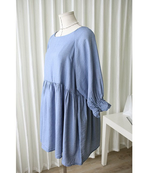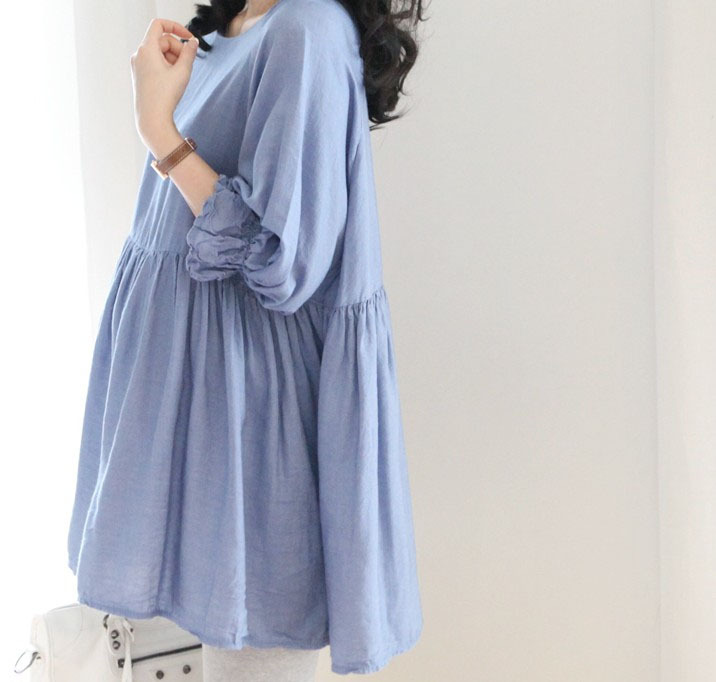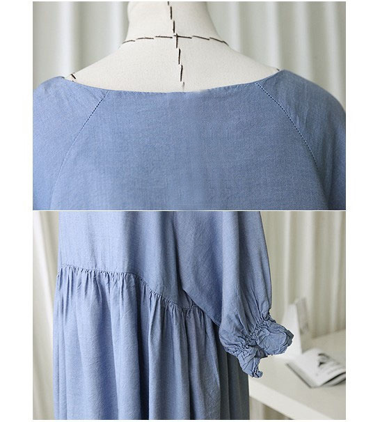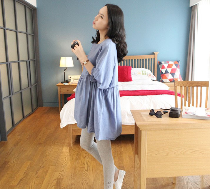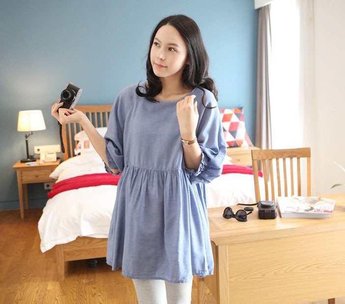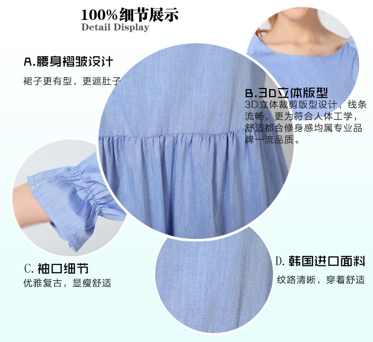 韩版孕妇装夏装 韩版圆领公主袖孕妇裙 优雅纯色蓝色孕妇上衣1005