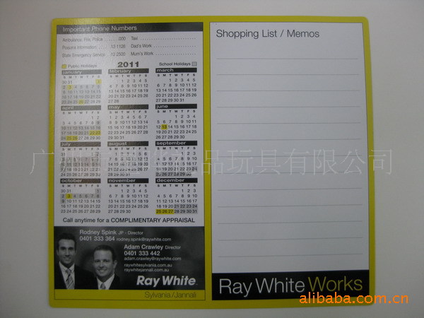 4)磁性留言板 白板:采用软胶磁铁(或纸板)+铜版纸四色印刷裱光膜+可擦笔