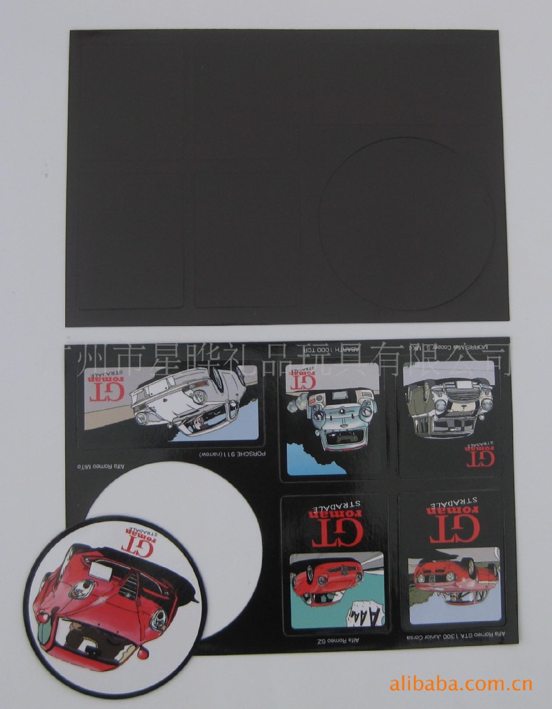 1)磁性冰箱贴:采用下面软胶磁铁+上面铜版纸彩色印刷腹膜制作而成。
