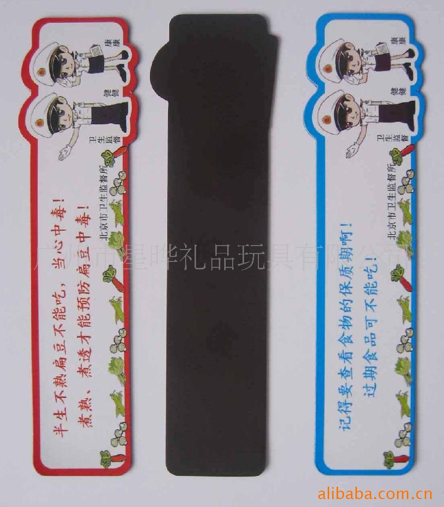 3)磁性书签:采用下面软胶磁铁(对吸磁)+上面铜版纸四色印刷腹膜对折制作而成。