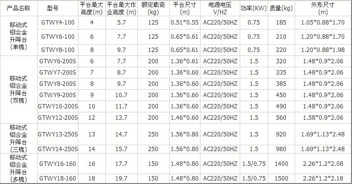 【产品简介】 GTWY铝合金升降平台、升降机可载重100-200公斤,起升高度4-16米,采用高强度优质铝合金材料,具有造型美观、体积小、重量轻、升降平稳、安全可靠等优点。广泛用于工厂、宾馆、餐厅、车站、影剧院、展览馆等场所,是保养机具、油漆装修、调换灯具、电器、清洁保养等用途的最佳安全伴侣。 |