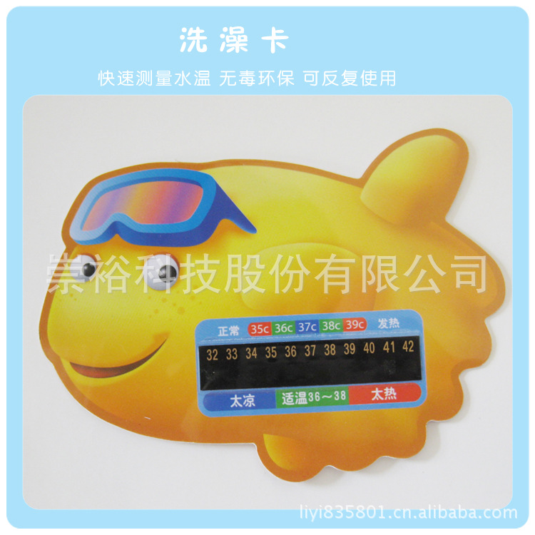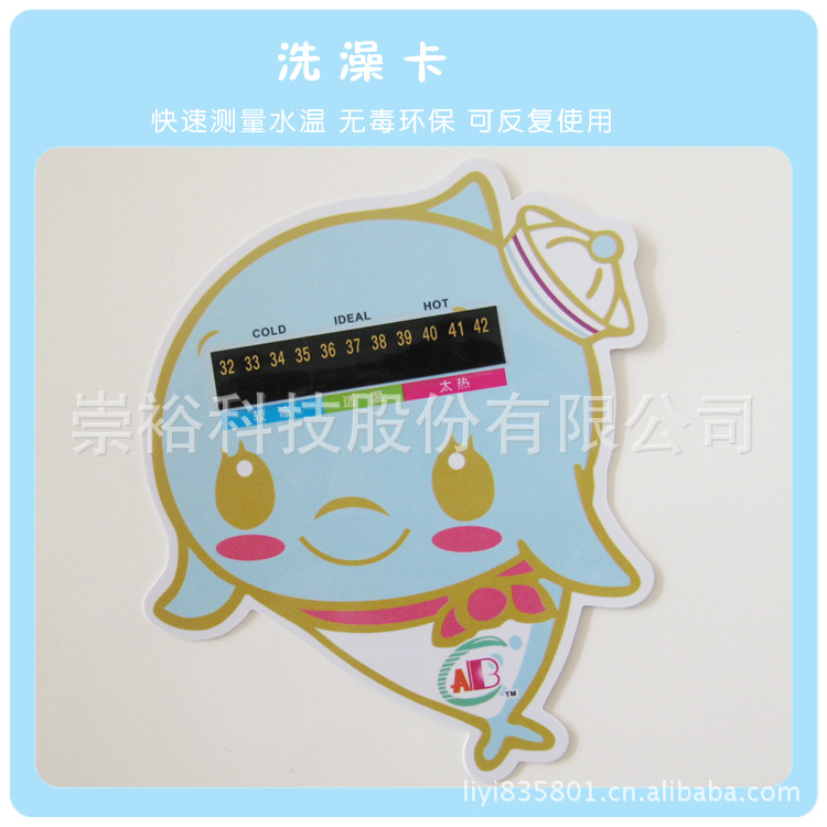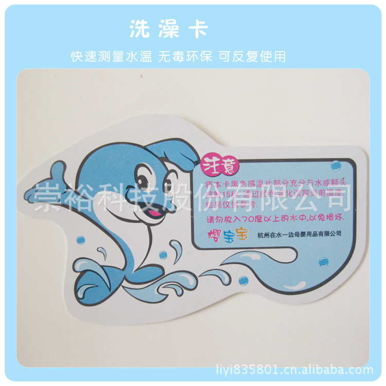 将洗澡卡至于水中,能准确测出水温,液晶读数,直观方便、随身携带,并可任意弯曲,不易断裂,避免了传统温度计造成的玻璃破碎和水银中毒的危害,具有安全、环保、科学、实用的优点,专业呵护婴儿的洗澡卡是每家必备的家庭医生