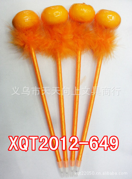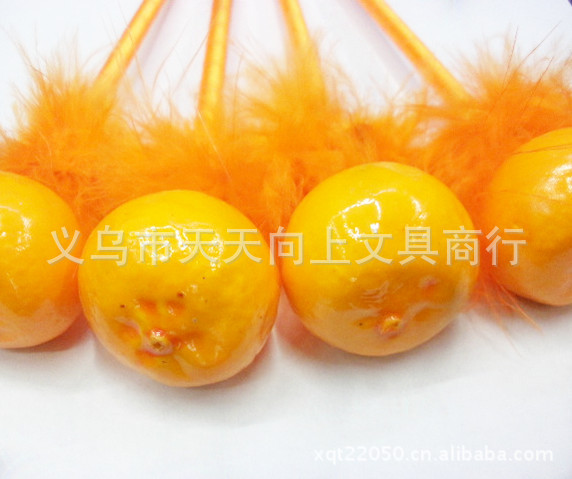 3:该水果工艺笔羽毛是经过多道工序生产而成。迎风飘扬的多色羽毛与笔杆颜色溶为一体,再搭配各种卡通造型,漂亮的花朵,爱心饰品,让整支笔充满活力。
