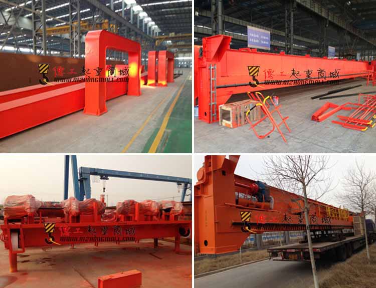 小车架由钢板压延成形的成∏形槽钢的横梁及薄板焊成的箱形结构的小车主梁拼装成工字形小车架,起升机构采用CD1或MD1葫芦,5~10t运行机构靠2只锥形制动电机完成,16、20t小车运行机构采用YSE电机集中驱动,纵梁旁边设有走台栏杆,以便维修葫芦及运行机构。起重机运行机构 起重机是采用分别驱动形式,5~10t驱制动靠锥形制动电动机来完成,这种结构与普通双梁吊的大车运行机构相比具有装配简便,走台结构重量轻等优点。16、20t大车驱动采用YSE电机加卧式减速器驱动,这种结构与普通双梁吊的大车运行机构相比具有驱制动平稳,省去制动器,YSE电机内带有制动器。