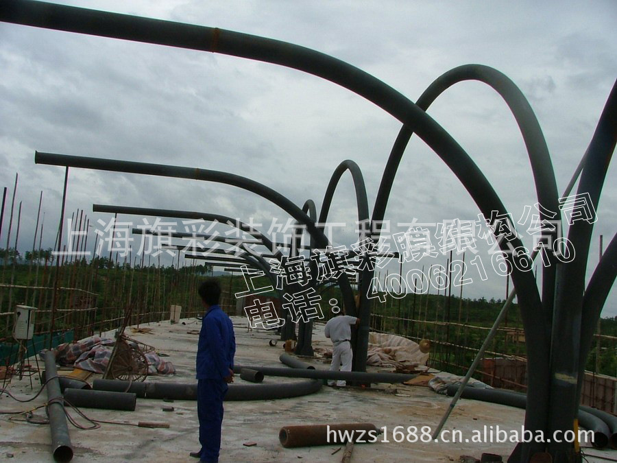 景观篷骨架采用钢结构(国标Q235)钢管一般厚度在: 5mm、6mm 7mm 8mm 9mm材料制作而成,钢结构要经过反复加工(切割、打磨、除锈、喷底漆、中间漆、面漆、成品后在做后期处理,从而达到持久不生锈效果),所以景观篷、膜结构车棚、膜伞、钢结构车棚等产品寿命是别的产品无法达到钢结构膜结构产品的.景观膜结构款式独特、新颖、寿命长、美观、亮丽、时尚。