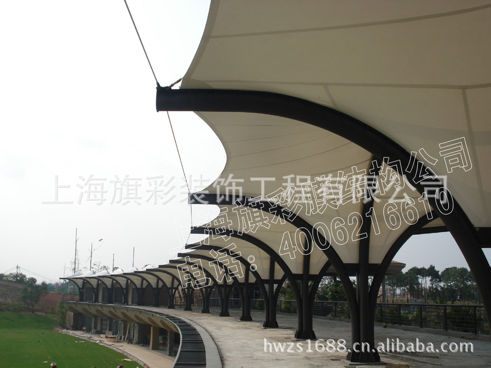 上海旗彩膜结构产品选用的材料是经过专家们的反复测试(抗风、抗震、抗压、耐热、防冻、防雨等等)程序最终制作出大小型景观篷、膜结构、停车棚、体育场膜篷等等,一般膜结构用料选用:900g 1100g 1200g 其厚度在:0.8mm 0.9mm 1.0mm 1.1mm.膜布面料特别(自洁功能)、让面料持久如新、面料颜色有多种,景观篷的膜面料寿命在8年-25年不等,膜布面料也可选择(进口及国产面料)