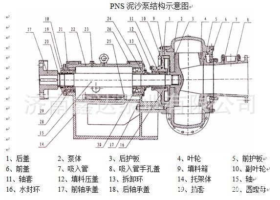 1、 PNS系列泥浆泵主要由泵体、叶轮、护板、填料箱、副叶轮、轴、托架体等零部件构成。
