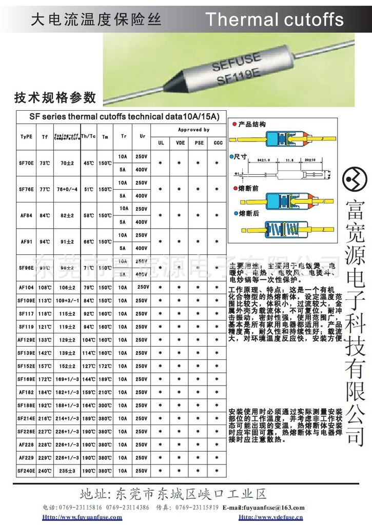 供应大电流铁壳 陶瓷温度保险丝SF-72~240度 10A/15A UL ROHS
