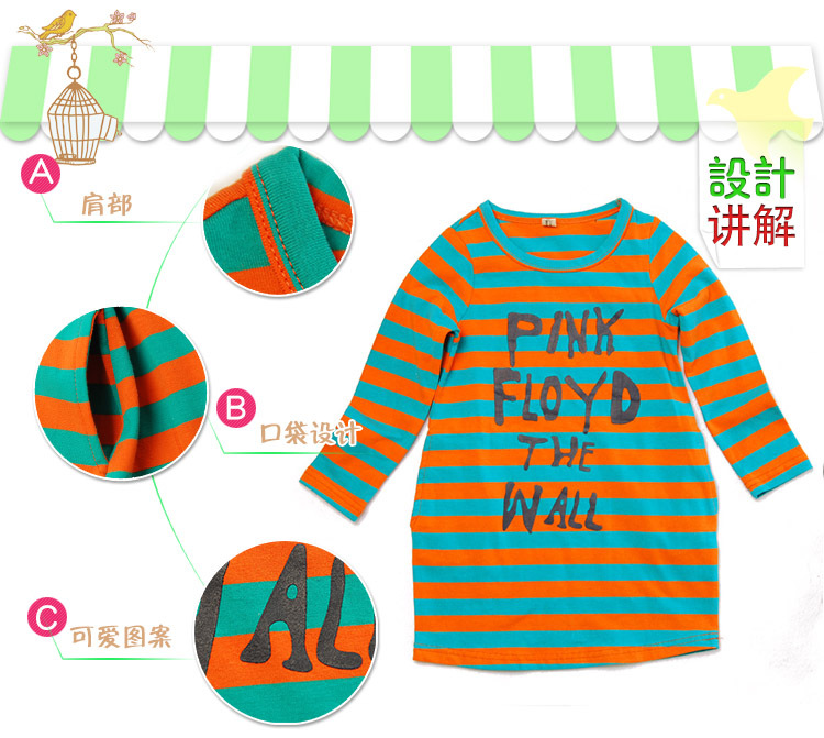 春款童装女童春装 潮韩版粗条纹休闲宽松长款字母T恤 长袖打底衫