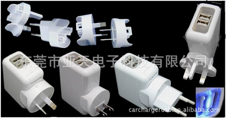 1. 本产品设置二个USB输出接口,可同时对iPad及三星Galaxy平板电脑充电。透明灯镜配蓝色LED,高贵美观。 本产品可配六款AC插头(标准四款:欧规,美规,英规,澳规)另还有巴西插脚,韩规插脚可供选择。本产品提供两个USB输出接口, 可同时为2台设备充电, 为您的iPad, iPhone, iPod(包括iPod shuffle, iPod Touch, iPod Nano等苹果产品)及三星平板电脑充电,以致其它USB充电支持MP3,MP4,手机,数码相机,游戏机,GPS,数码相框,蓝牙耳机等数码设备充电。长时间使用中,输出电流保证依然达到1A, 质量绝对令人满意,是一款值得你信赖而放心使用的USB充电器。