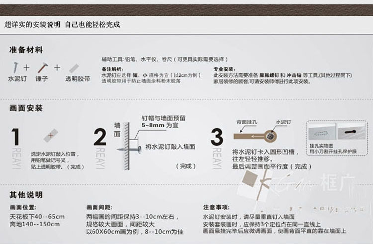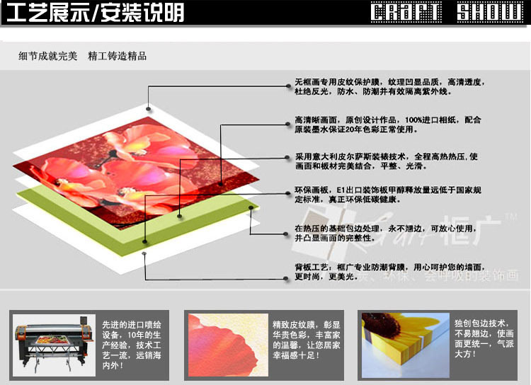 福州框广工艺品有限公司成立于2004年开春,我们迎着朝阳出发,一路披荆斩棘,经过六年的拼搏努力,现已拥有独立生产线,具有研发、专业设计和生产团队的无框画生产企业,是国内无框画工艺品行业知名品牌。公司率先引进德国最新的画面输出设备,使画面更为清晰可人,防水不褪色,通过内置式挂槽让其画面与墙体完美结合,融为一体;加上精湛的纯手工制作工艺和真空热裱结合,使每幅画面更加精美,充满质感。青春热情的我们追求卓越的品质和周到的服务,现已在国内大中城市建立了优越的销售网络,并与众多国内著名品牌企业建立了长期战略合作关系,产品主要出口韩国、马来西亚、新加坡等国家。创造心,卓越路。我们的愿景是通过不断努力,以工艺品为支柱,谋求企业的长期、稳定、健康发展,使企业建设成为一个具有核心价值和竞争能力的一流公司,为企业各相关利益主体创造持续增长的价值,成为国际领先的综合工艺品公司和百年品牌。框广公司以诚信与品质作为企业核心,以严格的控制、科学的生产管理、优良的销售服务赢得了广大客户的信赖与支持。对产品质量层层把关、责任到人,真正做到出厂产品合格率100%以上。我们将不断地开拓创新,真诚期待着与您的合作。