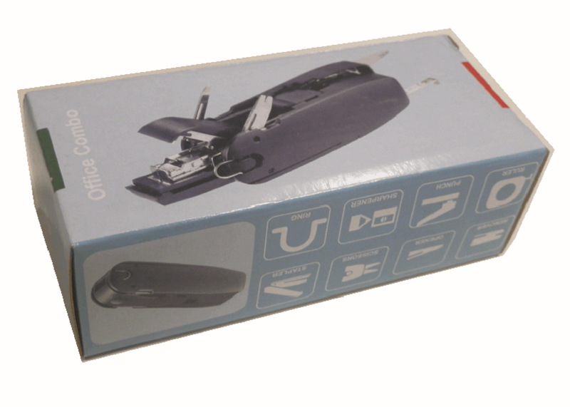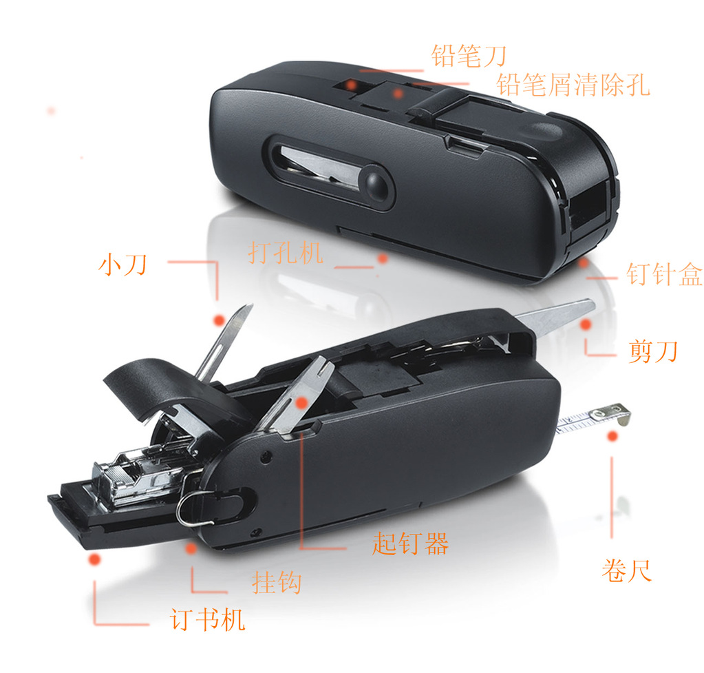 剪刀、卷尺、钉书机、储藏盒、铅笔刨、打孔机、起订器、小刀、一字螺丝刀、挂钩,共十种功能