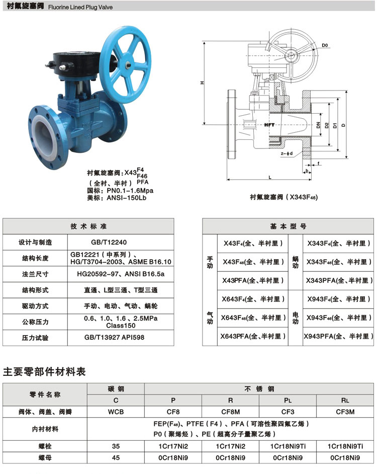 衬氟旋塞阀是关闭件或柱塞形的旋转阀,通过旋转90度使阀塞上的通道口与阀体上的通道口相同或分开,实现开启或关闭的一种阀门。衬氟旋塞阀的阀塞的形状可成圆柱形或圆锥形。在圆柱形阀塞中,通道一般成矩形;而在锥形阀塞中,通道成梯形。这些形状使衬氟旋塞阀的结构变得轻巧,但同时也产生了一定的损失。衬氟旋塞阀最适于作为切断和接通介质以及分流适用,但是依据适用的性质和密封面的耐冲蚀性,有时也可用于节流。用带通孔的塞体作为启闭件的阀门。塞体随阀杆转动,以实现启闭动作。衬氟旋塞阀的塞体多为圆锥体(也有圆柱体),与阀体的圆锥孔面配合组成密封副。旋塞阀是使用最早的一种阀门,结构简单、开关迅速、流体阻力小。普通旋塞阀靠精加工的金属塞体与阀体间的直接接触来密封,所以密封性较差,启闭力大,容易磨损,通常只能用于低压(不高于1兆帕)和小口径(小于100毫米)的场合。