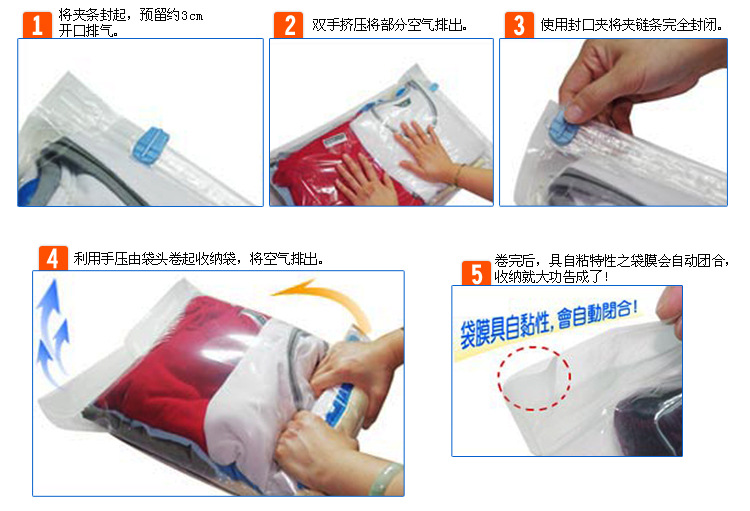 5.用拉链在封口处来回滑动,确保袋子真正封闭抽气完成后,移去吸尘器或气泵,盖上防尘盖既可。(用泵的人注意,因为大袋子要抽的时候长点,这时候不用一下子抽完,中间可以停下来,空气是不会进去的。等休息完之后,或者有时间再接着抽气。)