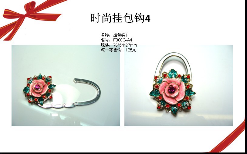 挂包钩是一种新颖得产品,目前在国内使用还不是很广泛,主要流行于欧美日韩国。其主体是锌合金材料制成,不生锈,底部有黑色防滑垫,确保挂包的时候很牢固。持包钩可用来在酒店、餐厅、咖啡屋等地方的桌缘或户外得绳索、树枝等上面挂放钱包,手提袋、提包等轻便物品!挂包钩的出现,给现代女姓带来了很大得方便、挂包钩小而精致,又方便携带,越来越受国内外女士的喜爱!它可以把包包挂在视线可及得桌子边沿,干净,方便,安全。