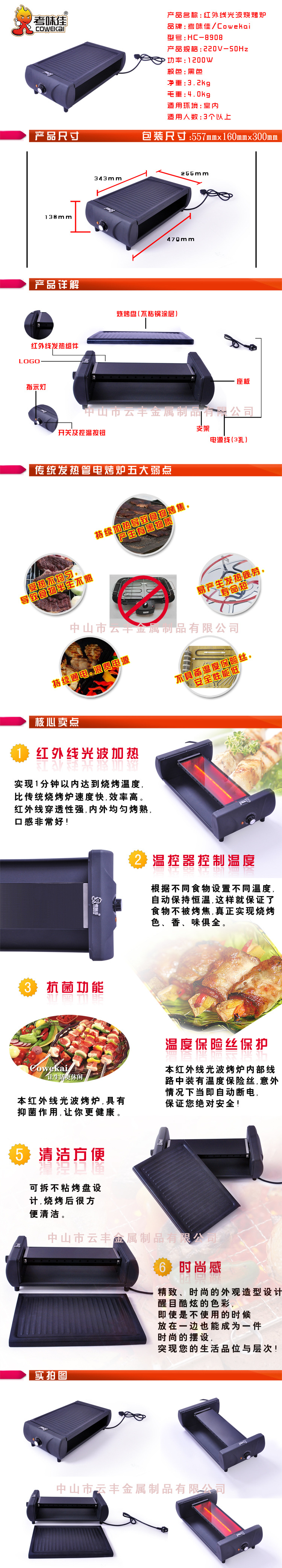 该产品插电1分钟内即可达到烧烤温度,可拆接油盘设计,可拆不粘烤盘设计,烧盘易清洁。本红外线光波烤炉内部装有温度保险丝,意外情况下会自动断电,以便保证您的安全。精致时尚的外观,醒目酷炫的色彩。不使用的时候也能成为一件时尚的摆设,提高您的生活品位与层次!
