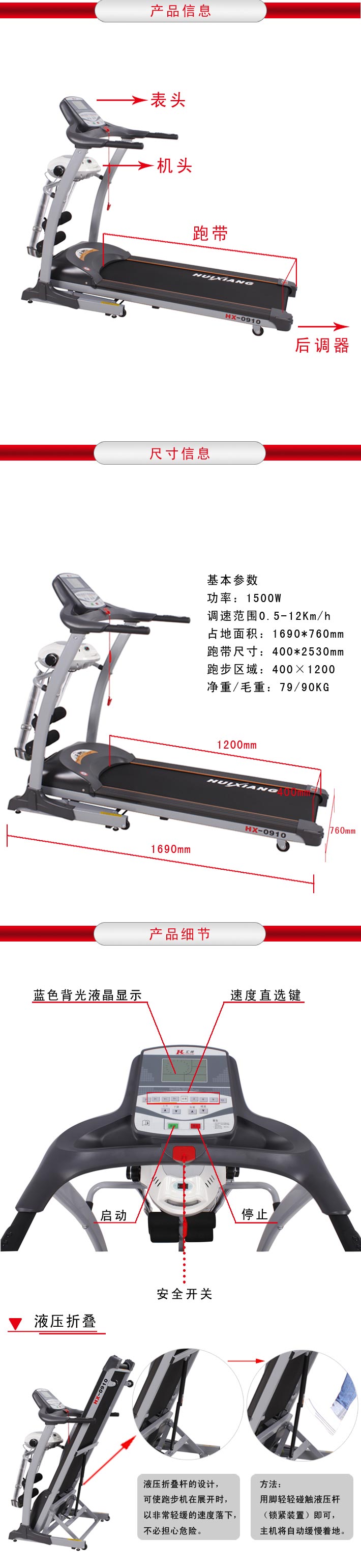9具有多功能,除跑步外还可进行按摩、仰卧起坐功能,按摩器可对腰、臀、腿等部位进行按摩,改善气血循环作用(注:HX-0910BS无此功能)