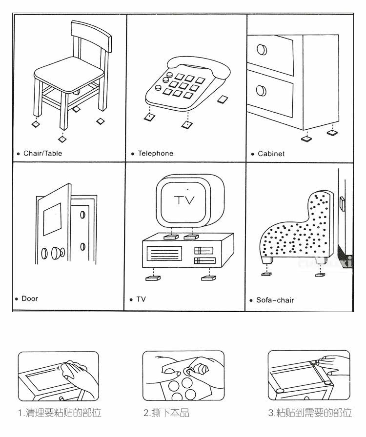 1、用于桌椅等家具脚位可防止磨损地板及漆面,并降低移动时发出的噪音。 2、也可用于祢补家具,办公桌,厨柜,电器脚位不平或原脚位之破损。 3、适用于电视机,音箱,VCD机,电脑等底部。适用于平底花瓶,橱柜等底部。适用于不经常移动的重物下面