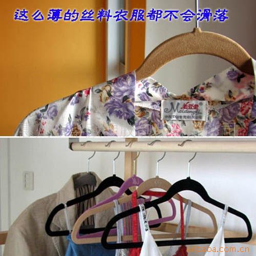 真丝、尼龙布料,柔软及表面光滑的衣服,领口较宽的衣服,围巾等总是从衣架上滑落到地上,植绒衣架,使用特殊纤维制成柔软的表面可以防止衣服滑落并且同时保护贵重的衣物.