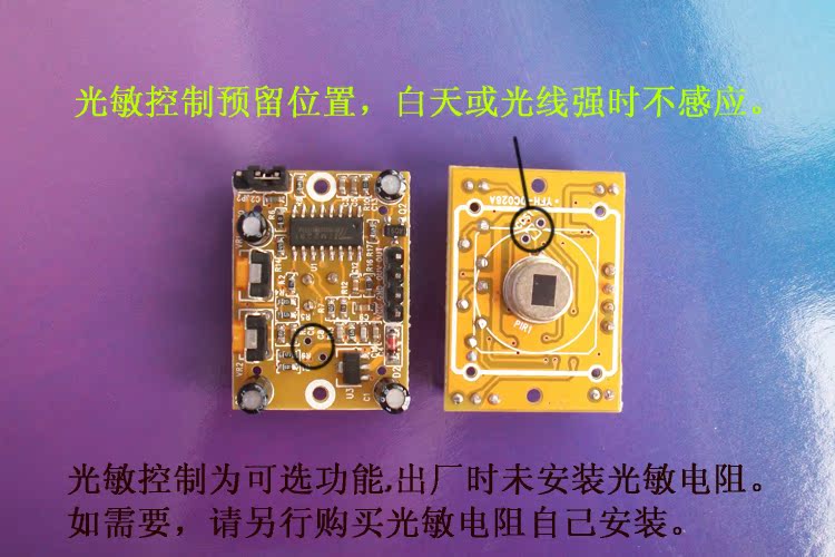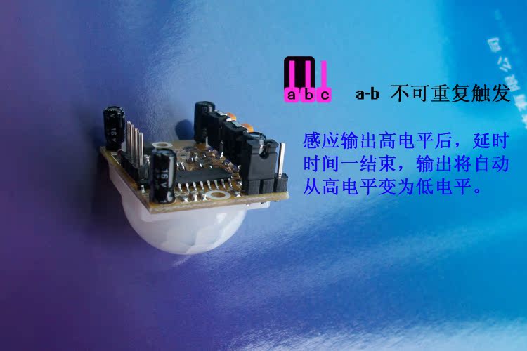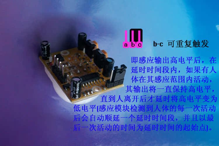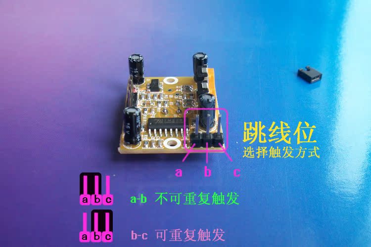 2.光敏控制(可选):模块预留有位置,可设置光敏控制,白天或光线强时不感应。光敏控制为可选功能,出厂时未安装光敏电阻。如果需要,请另行购3.两种触发方式:ab不可重复,bc可重复。可跳线选择,默认为bc。