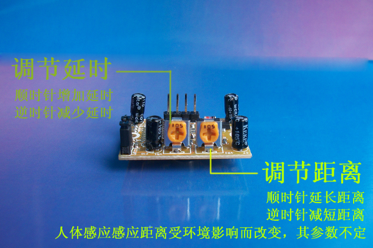 4.具有感应封锁时间(默认设置:30秒):感应模块在每一次感应输出后(高电平变为低电平),可以紧跟着设置一个封锁时间,在此时间段内感应器不接收任何感应信号。此功能可以实现(感应输出时间和封锁时间)两者的间隔工作,可应用于间隔探测产品;同时此功能可有效抑制负载切换过程中产生的各种干扰。