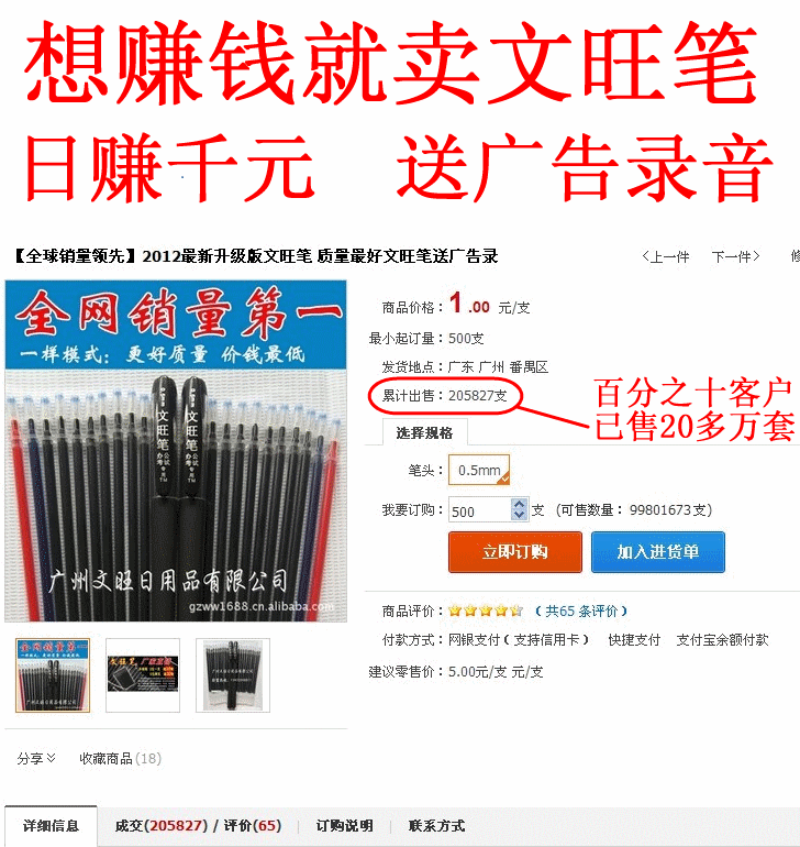 文旺笔品牌商标所有权属于广州文旺日用品有限公司注册品牌,配有广告画和专业电台主持人录音!出厂价供应,量大可优惠,欢迎咨询合作:订货电话:13432008811