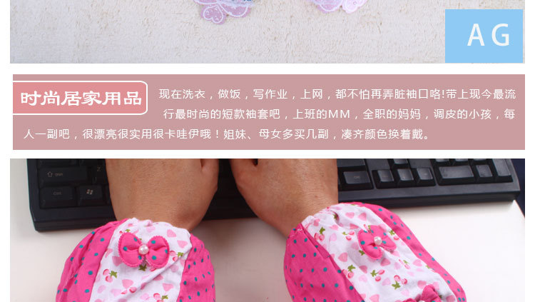 今年流行粉色白色,流行蕾丝花边,都是华丽丽的造型,可是又不耐脏,怎么办?没关系,戴上这些可爱的短袖套,不但解决了这一问题,还能提升时尚感呢,多备几幅,可以用来搭配不同的衣服,还能显得您很精干勤快哦。再也不用为袖套上的污渍麻烦啦。让做家务也成为一种享受。