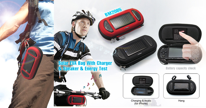 该产品美观大气,您可以通过产品表面的太阳能板给内置锂电池充电,同时,该音乐包可给您的手机等数码产品高效充电,满足您的应急用电需求。此外,该产品带有2个3W的音响, 您可以通过音频线连接到您的手机、电脑、MP4等设备,供您娱乐消遣。电量检测的功能让您随时知道该产品剩余电量,及时给您的产品充电。