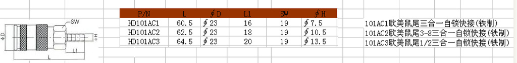产品描述:HD101AC欧美三合一鼠尾自锁快接