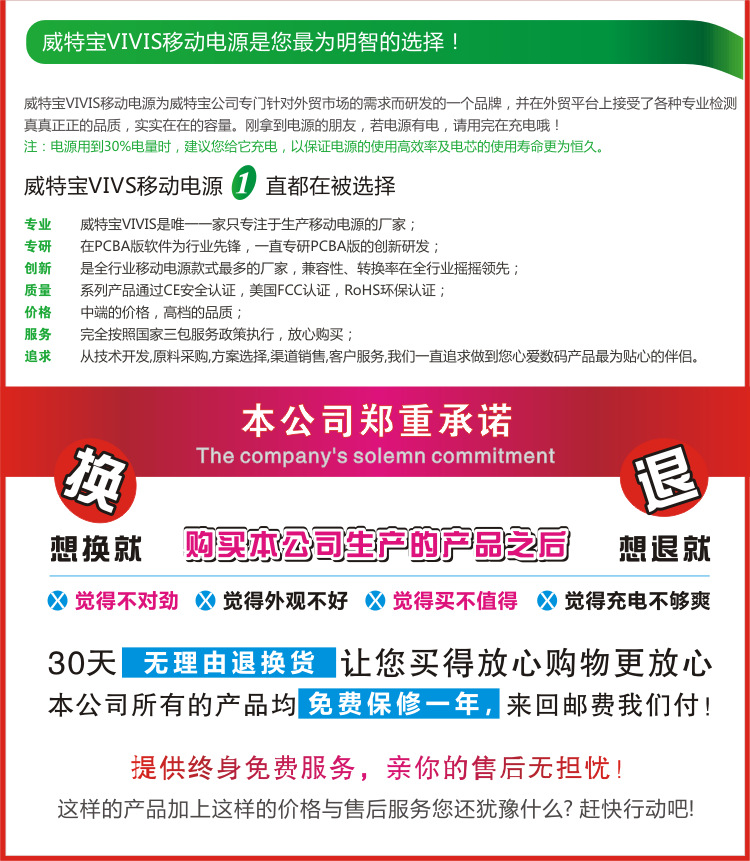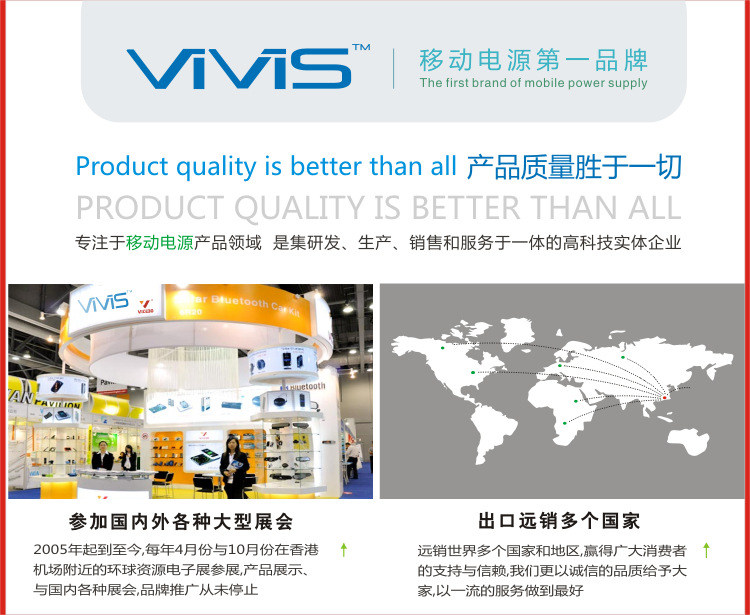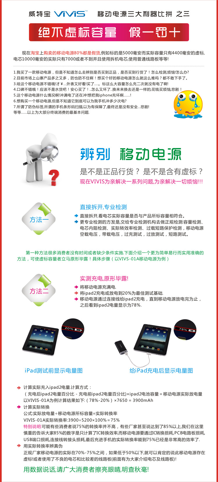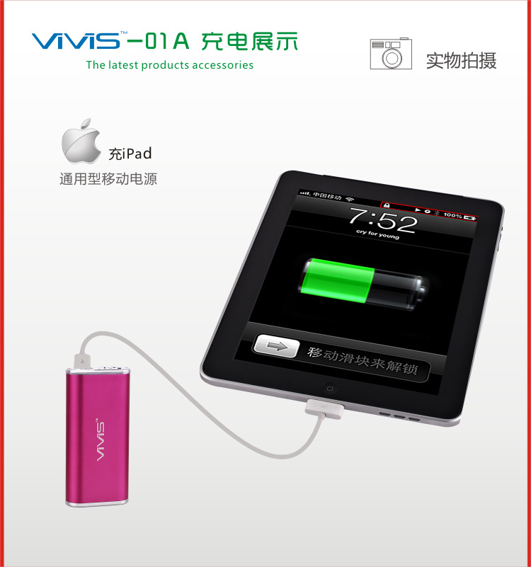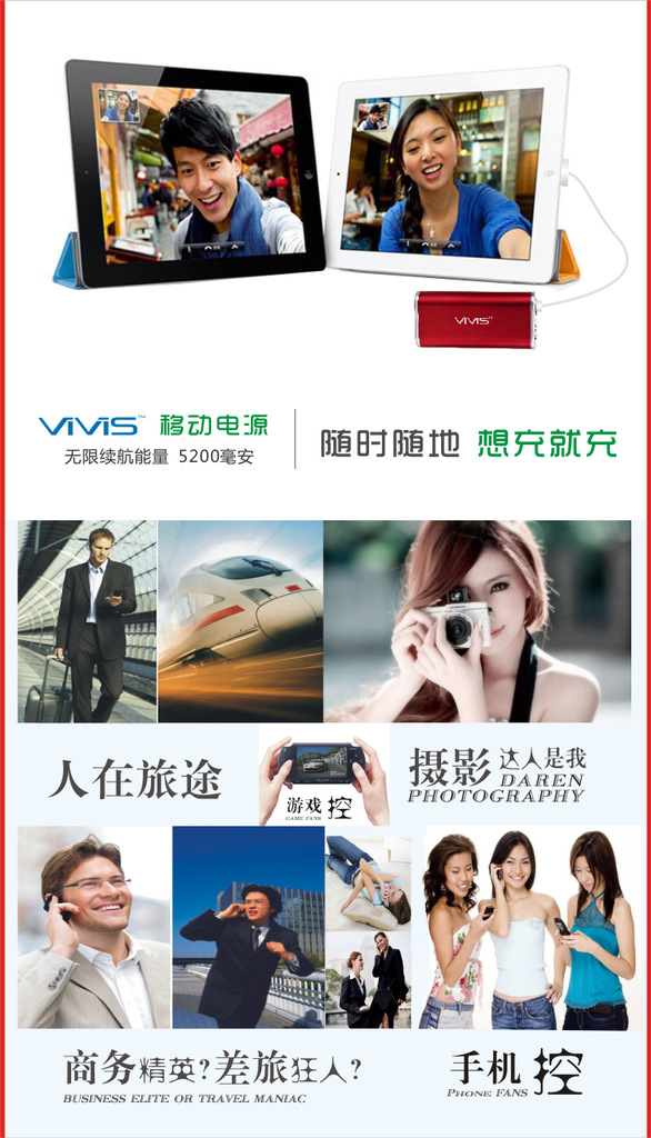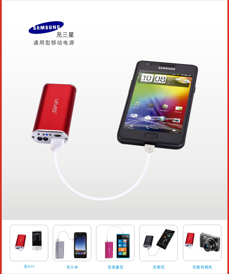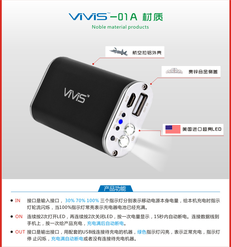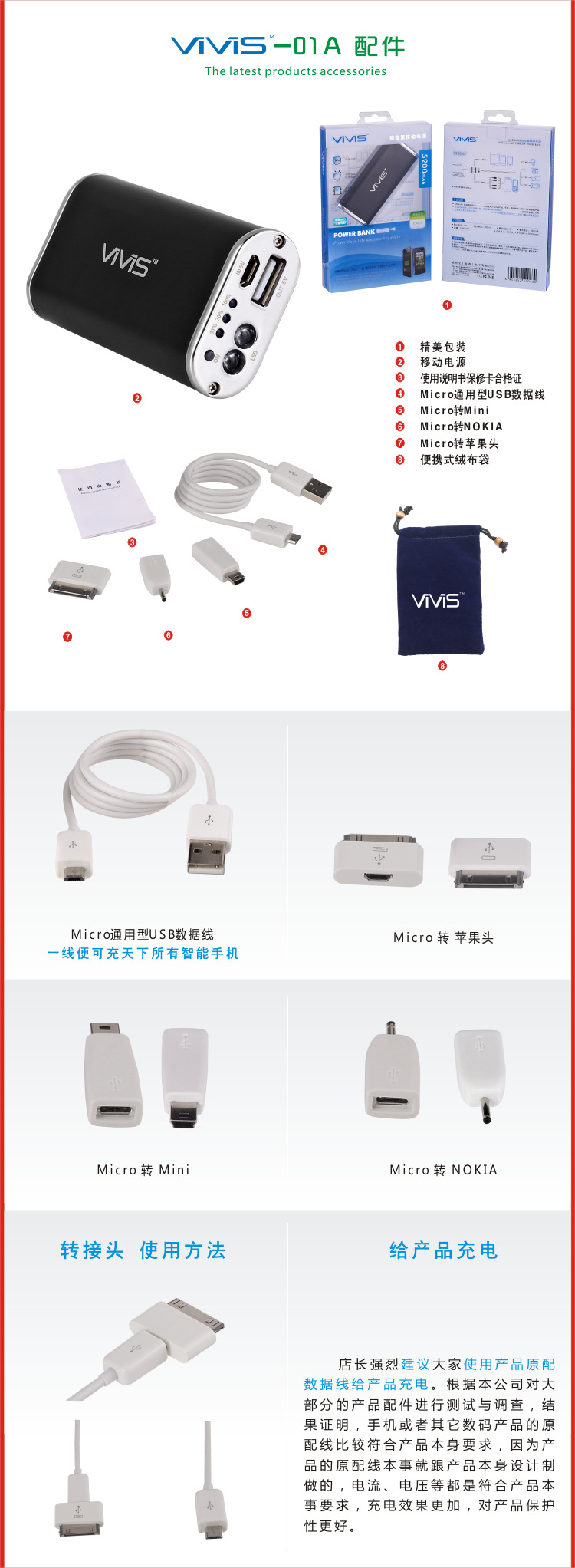 VIVIS-01A移动电源以其强大的能量储备,可以为数码产品及时进行多次充电。智能的充电电压自动检测系统,更好的保护您的数码产品。也是实用、时尚的送礼新品。 超强能量1. 足5200mAh的电流储备时刻“精神饱满”,在你数码产品突然断电时,移动电源立即为她充电续航。2.电池采取采用高品质锂聚合物电芯,安全又高效。 数码伴侣1. 最新运用数码产品充电电压自动智能检测功能,贴心保护您的手机、mp3、mp4、DV、数码相机等,大大增强他们的安全性和使用寿命。2. 您旅行途中,不必带N多充电器,只需带上能量王移动电源就可以满足所有数码产品充电要求。礼品新贵1、首推礼品行业“能量”概念,送礼就要送能量,代表精神、力量、年轻、健康,是一种全新理念、时尚尊贵的高档礼品。2、移动电源在国外是旅行者的贴心伴侣,数码产品发烧友的必备,彰显闲逸、丰富多彩、充满活力的生活。3、每人都遇到过数码产品工作中突然断电的尴尬时刻,送VTB-01A移动电源,急人所急,无异于“雪中送炭”。