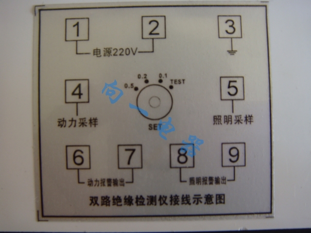 4.可根据需要设定报警值,旋动后板面SET旋钮设定报警档位,当电网绝缘电阻低于设定值时,仪器将输出报警讯号,此时报警灯点亮,当绝缘电阻恢复正常时,仪器报警状态自行取消。
