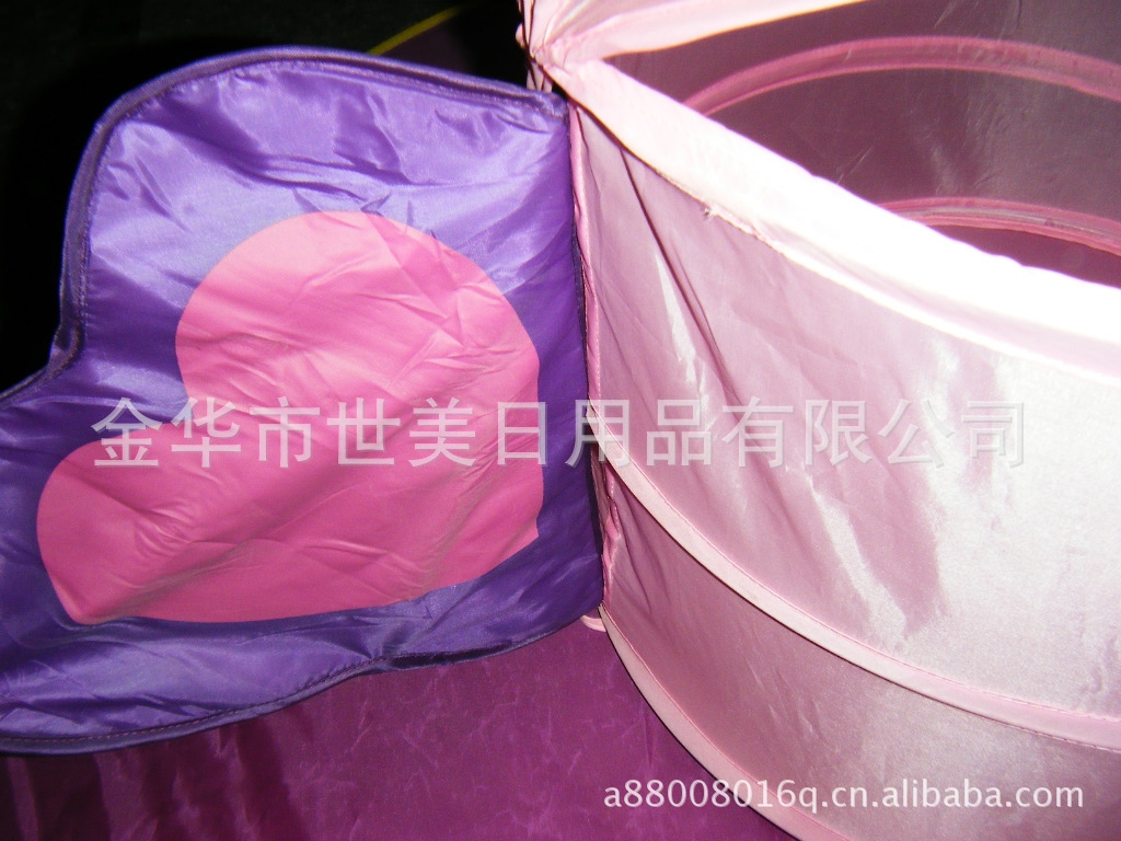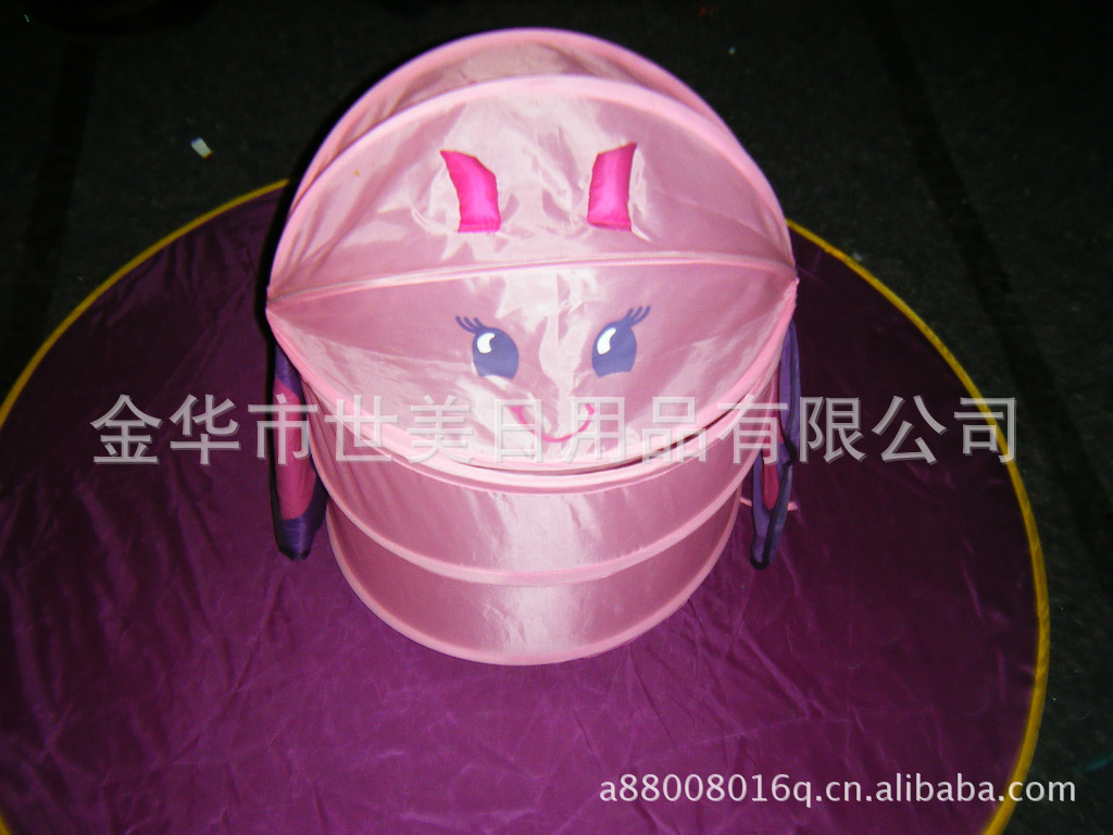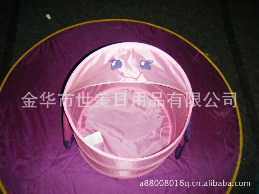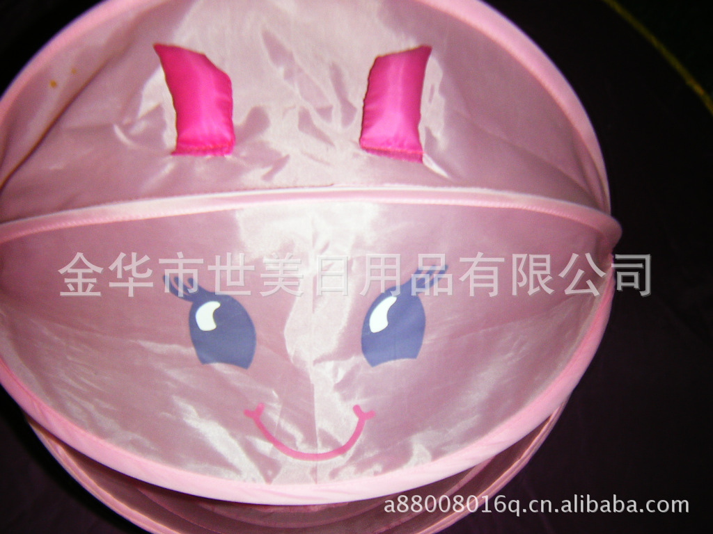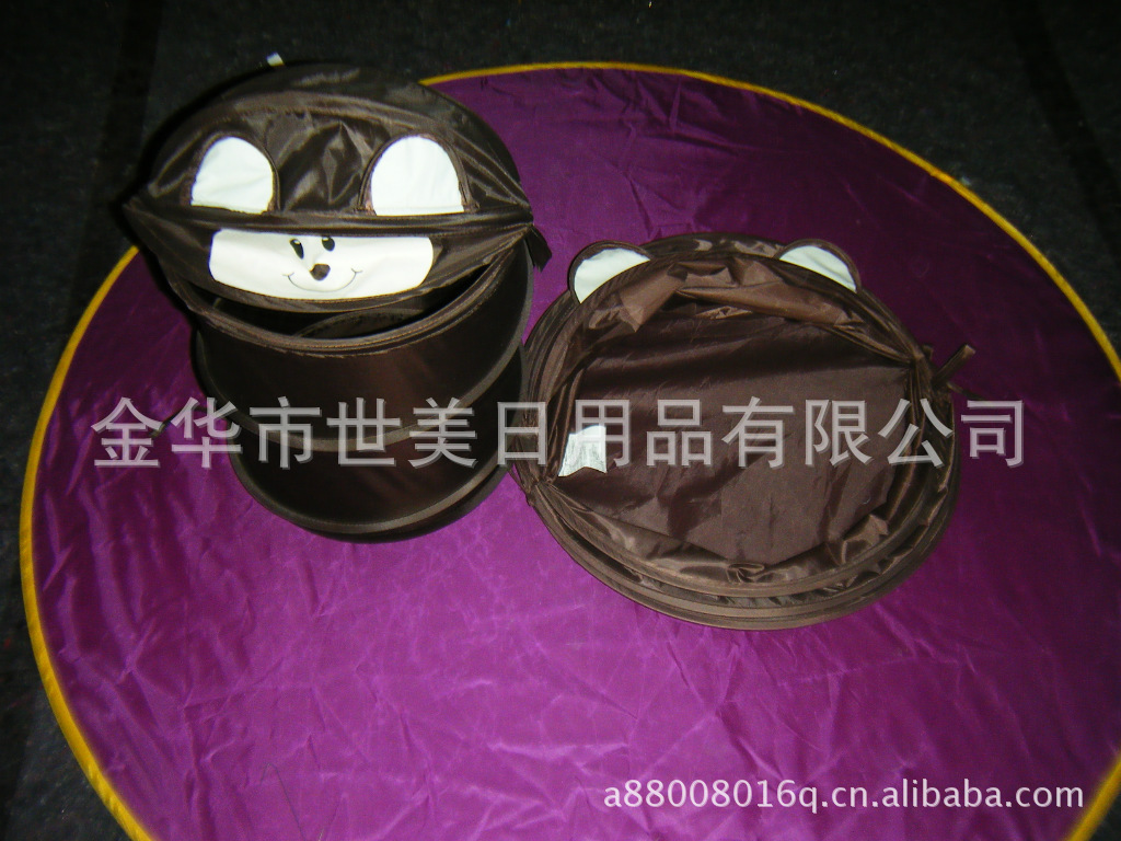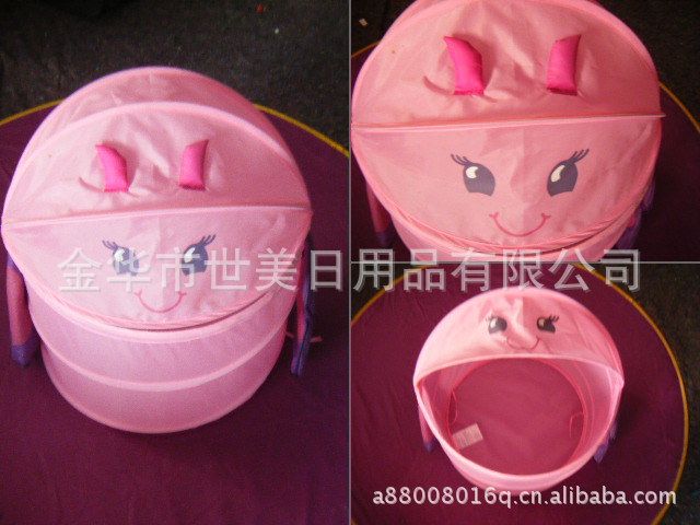 3、不用时折叠起来,只需把里外的系带打结,使用时只需解开两边的系带, 产品可自动弹起,体积小巧便于收藏,也适合于外出旅行,可爱型的衣物筐可以让爱好卡通的MM的房间增添动漫色彩!