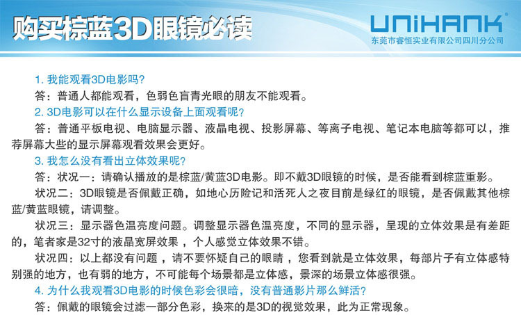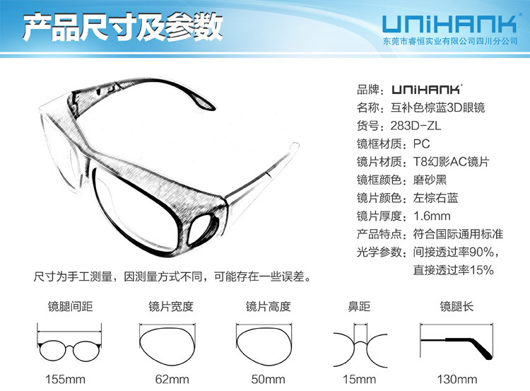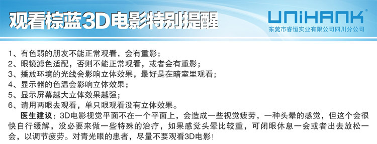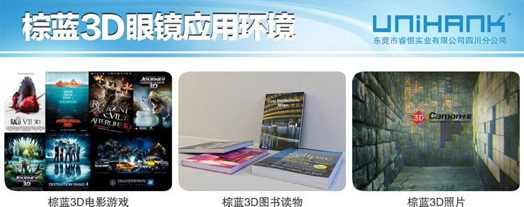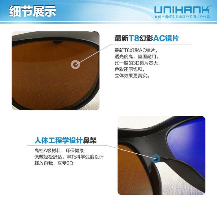 东莞市睿恒实业有限公司四川分公司(UNIHANK)于2012年成立,现位于四川成都,总部位于广东省东莞市,是领先于业界的立体方案、立体眼镜、立体设备的高科技企业。 UNIHANK拥有偏光片研发中心(组建中)、三维光学研发中心(组建中)两家领先于业界的技术团队作为最紧密的研发合作伙伴,并聚集了一批业界的精英,在产品研发领域处于行 业最先进水平。产品主要包括:户外运动眼镜、司机眼镜、滑雪眼镜、安全眼镜、摩托车眼镜、篮球眼镜、军迷眼镜、激光防护眼镜、骑行眼镜、特种功能眼镜及主动式电 子快门眼镜、高清3D机顶盒、偏光投影片、DLP投影眼镜、线偏光眼镜、圆偏光眼镜、红蓝立体眼镜、品红草绿立体眼镜、棕蓝立体眼镜、纸材眼镜、塑料眼镜、互补色眼镜、电影 院眼镜、3D电视眼镜、3D显示器眼镜、PC电脑电子眼镜、DLP投影机眼镜、光谱分离眼镜、光分离眼镜、解码眼镜、立体视频眼镜及其他光学片材等产品的开发、生产、销售。通过公司全体同仁的共同努力,本公司已在功能眼镜领域成为最专业之研发、生产销售企业,睿恒户外致力开发探讨其共通、共融之处,从而使产品多领域共用成为现实,为广 大户外运动爱好者提供最优质的产品,从而实现技术创新价值观。 公司业务、技术现已触及立体产品及技术、军工、汽车、户外运动、网络游戏、太阳眼镜、日用光学眼镜、光学 仪器、摄影、天文、航天、科教、玩具、娱乐、广告、等众多领域。目前,公司已与多个国际知名品牌保持良好的合作关系,产品远销欧洲、美洲、澳大利亚及亚太等全球 100多个国家和地区,享有良好的口碑。--------------------------------------------------------------------国际合作伙伴:华纳、华硕 ASUS、富士通FUJITSU、GIGABYTE、日立HITACHI、IMAX、LG、英伟达NVIDIA、松下Panasonic、飞利浦PHILIPS、Real D、三星SAMSUNG、夏普SHARP、天空SKY、索尼SONY、东芝 TOSHIBA、优派ViewSonic……国内合作伙伴:AOC、明基BENQ、CCTV、联想lenovo、TCL、TJ3D、长虹CHANGHONG、创维Skyworth、海尔Haier 、海信Hisense、康佳KONKA、清华同方……--------------------------------------------------------------------东莞市睿恒实业有限公司四川 公司以价格合理,生产周期短,服务周到为宗旨。高端的品质和优惠的价格使我们处于3D行业领先地位。我们希望携手更多的业内人士谋求发展,共创双赢。公司所经营的产品,款式新颖,质量可靠,现公司业务覆盖到全国各地,欢迎全国乃至全世界的新老顾客光临!